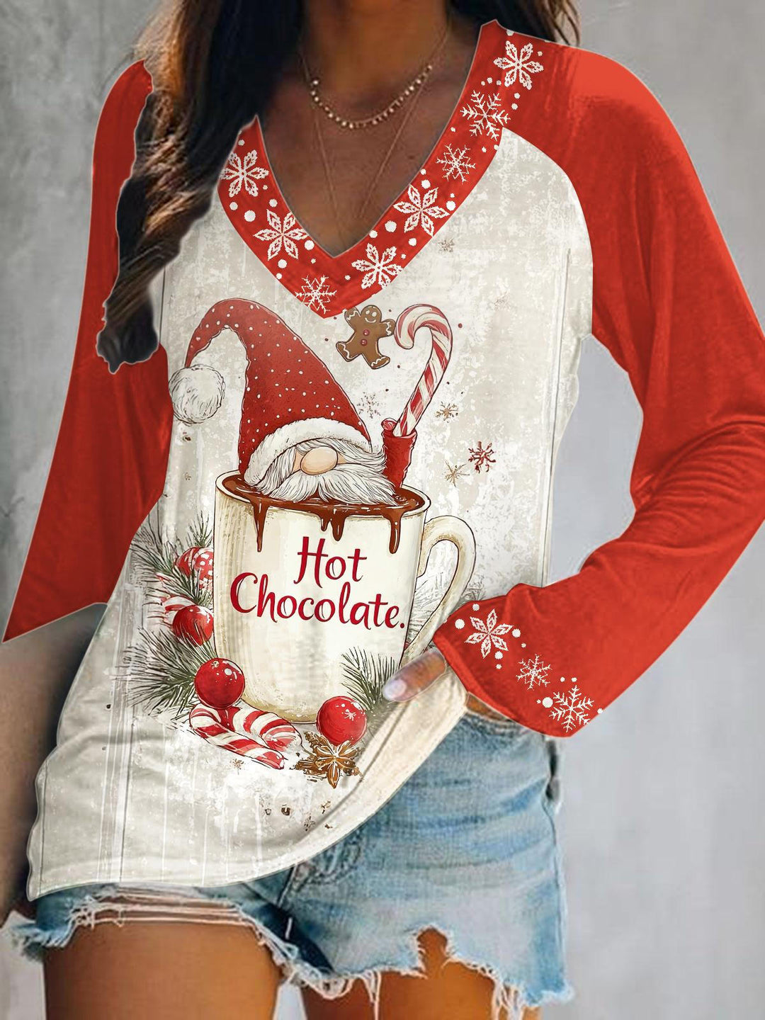 Fun Christmas Dwarf Print V-Neck Long Sleeve Top