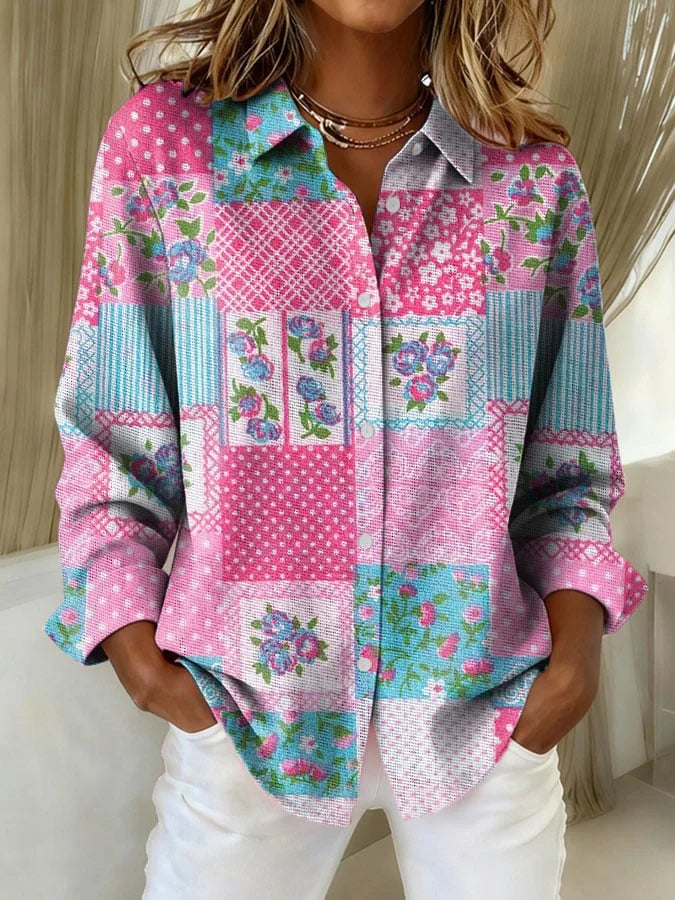 Women's Vintage Pink Floral Patchwork Print Casual Lapel Shirt