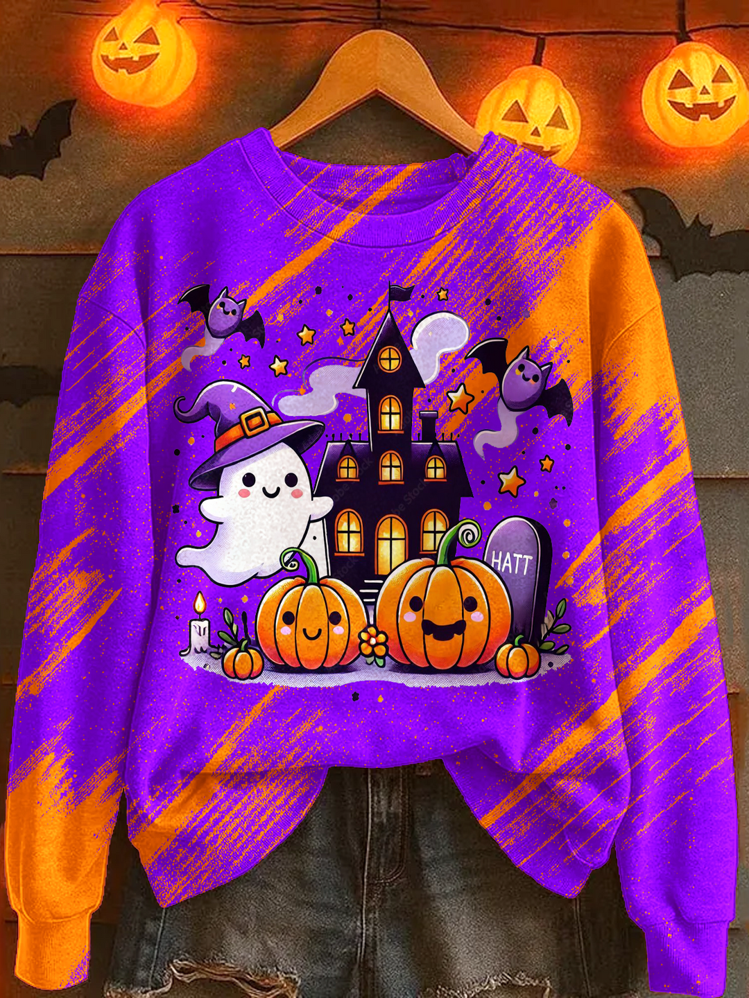 Halloween Ghost And Punmkin Printed Long Sleeve Casual Top
