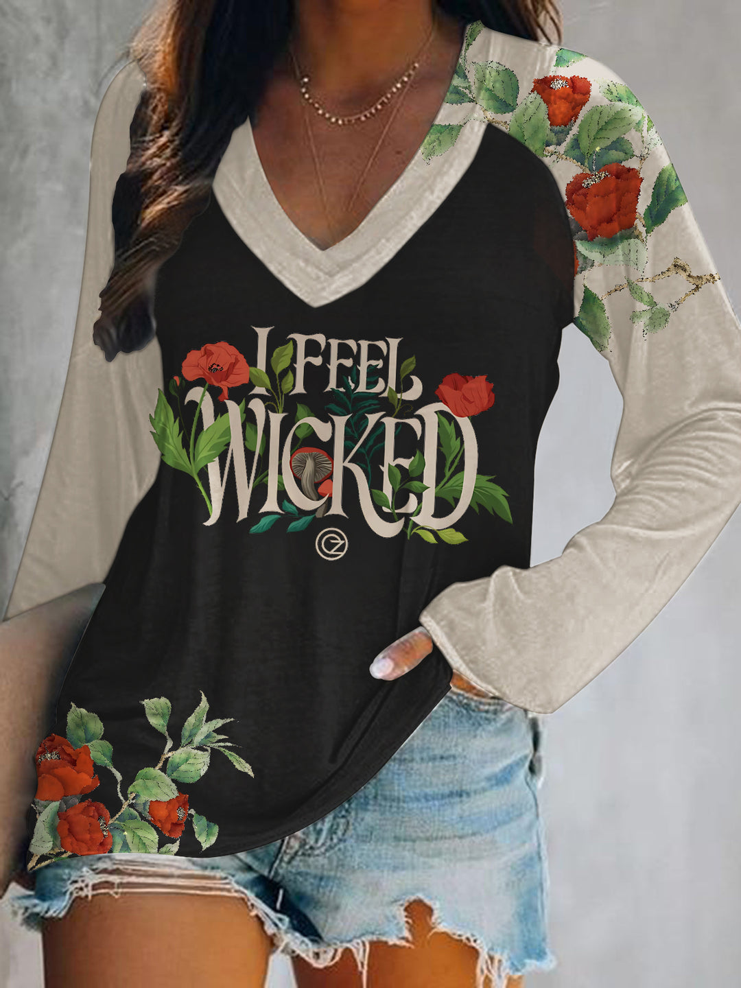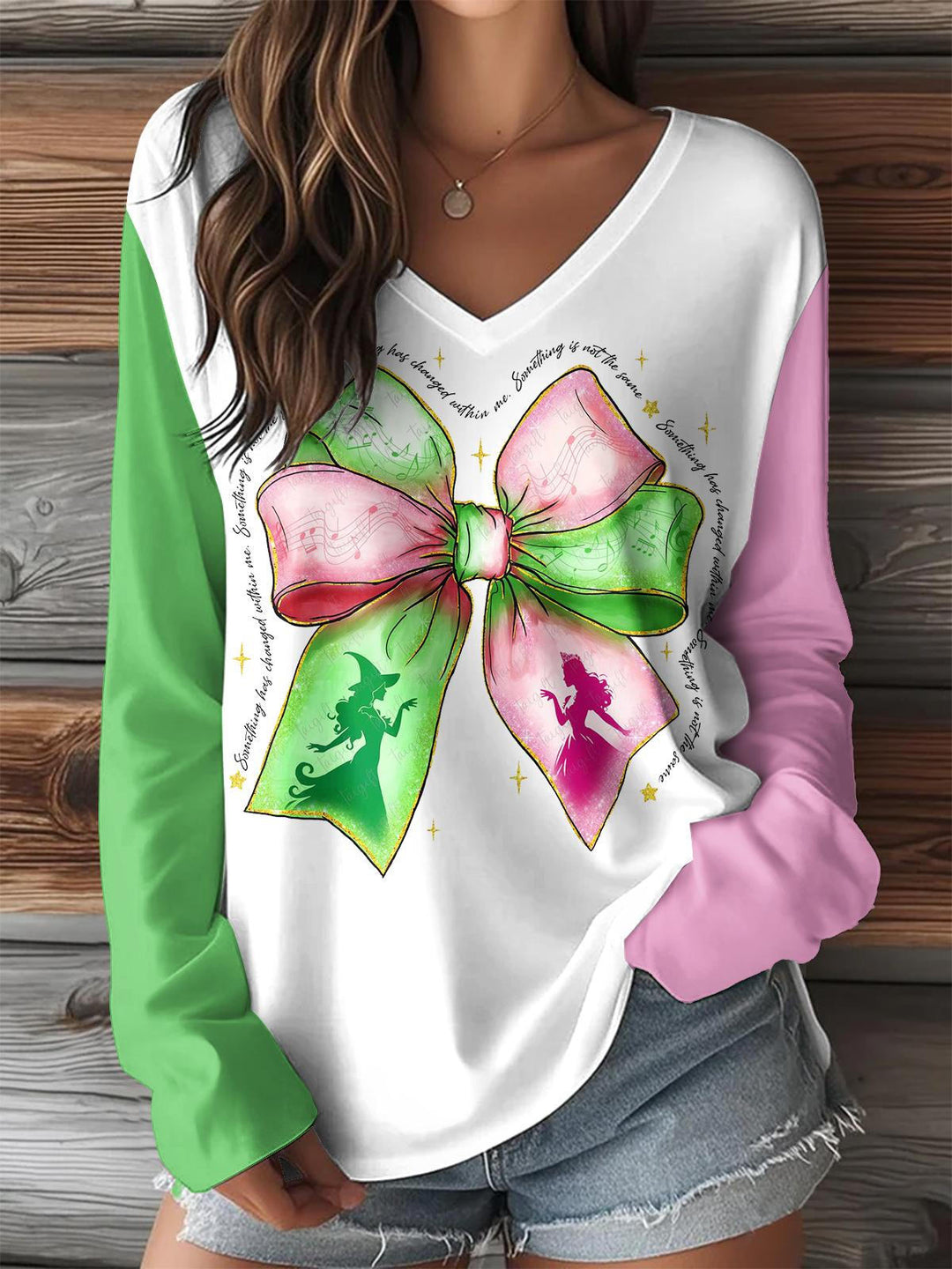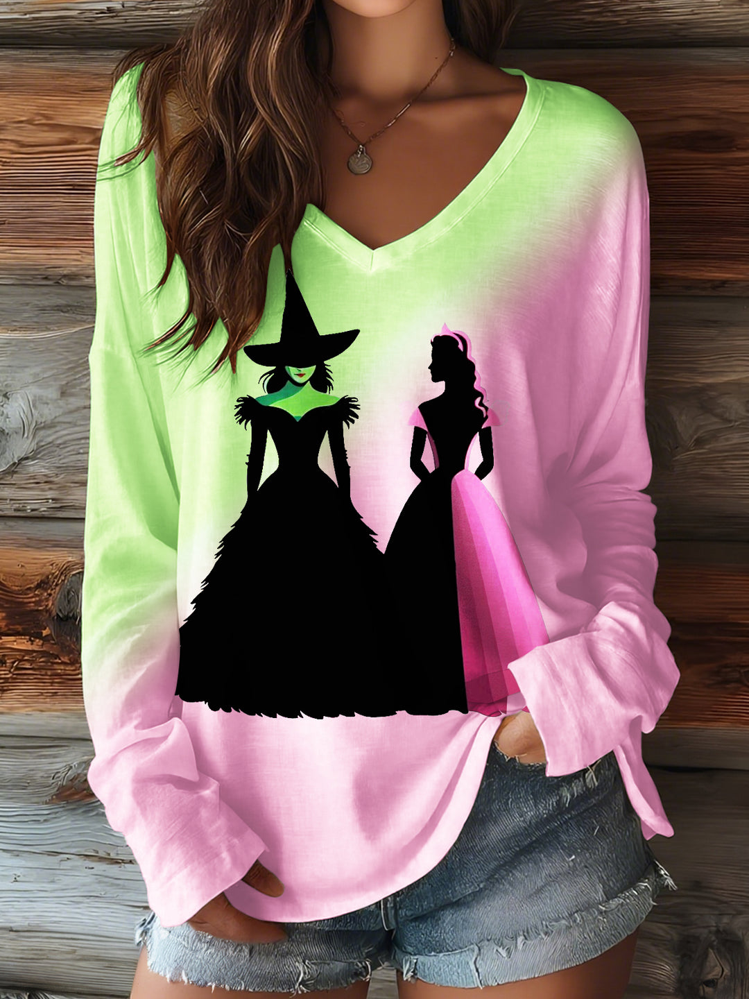 Retro Wicked For Good Print V-Neck Long Sleeve Top