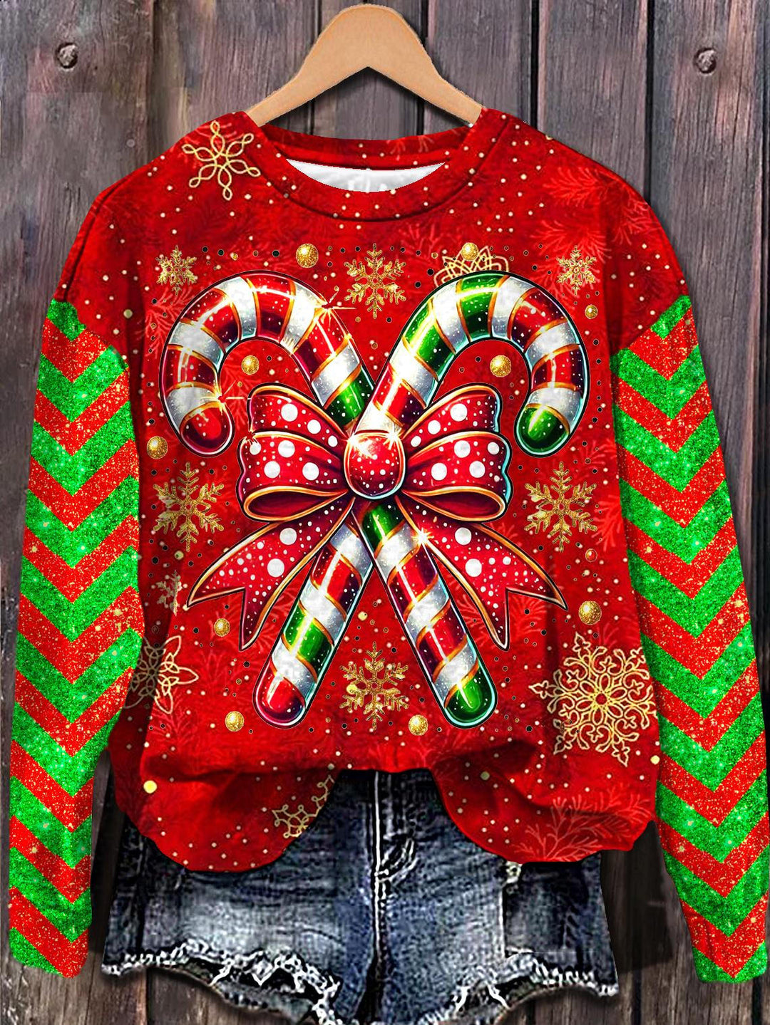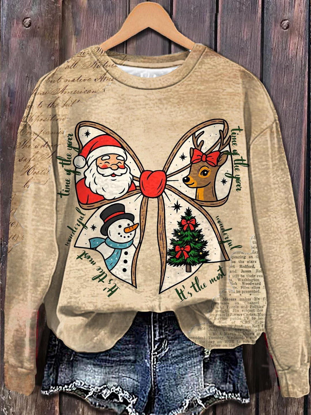 Retro Christmas Bow Printed Long Sleeve Casual Top