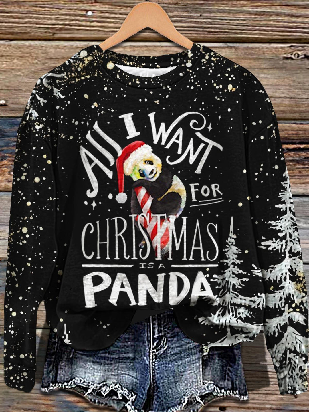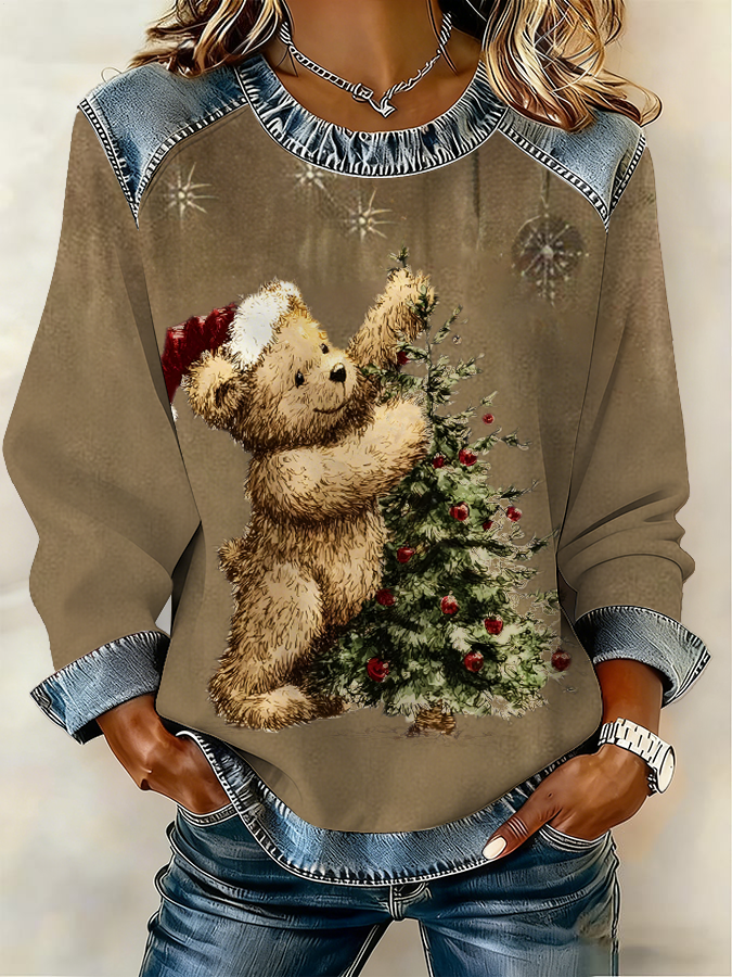 Women's Christmas Tree and Bear Raglan Spliced Crew Neck Sweatshirt