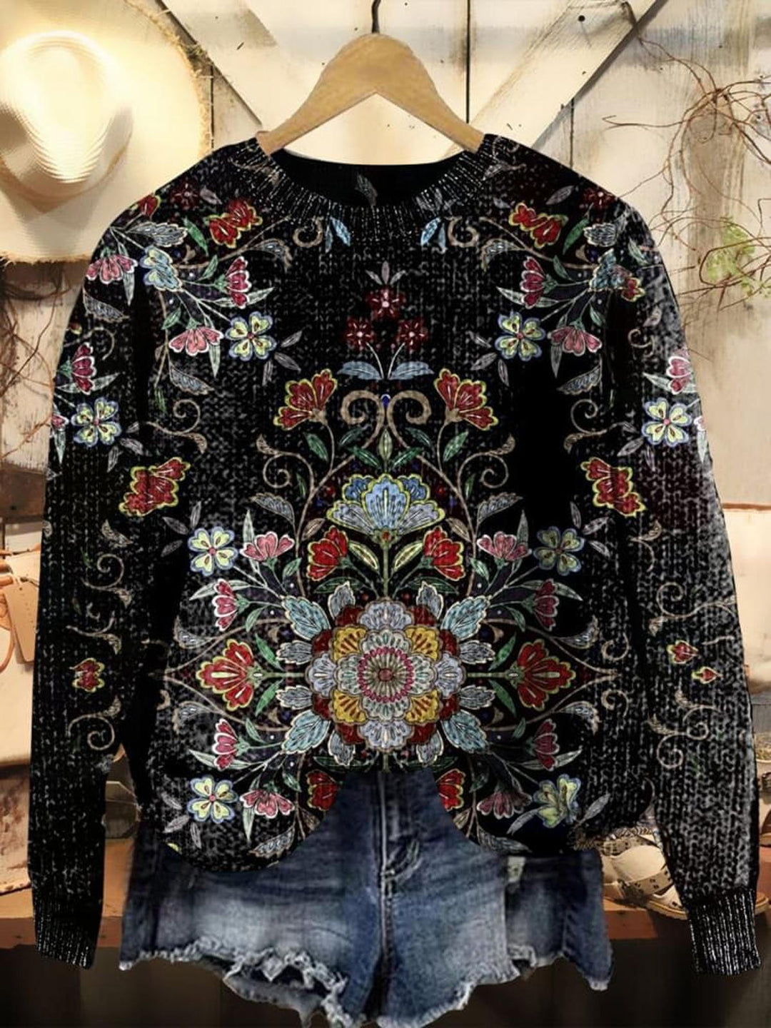 Vintage Flower Crew Neck Long Sleeve Sweater