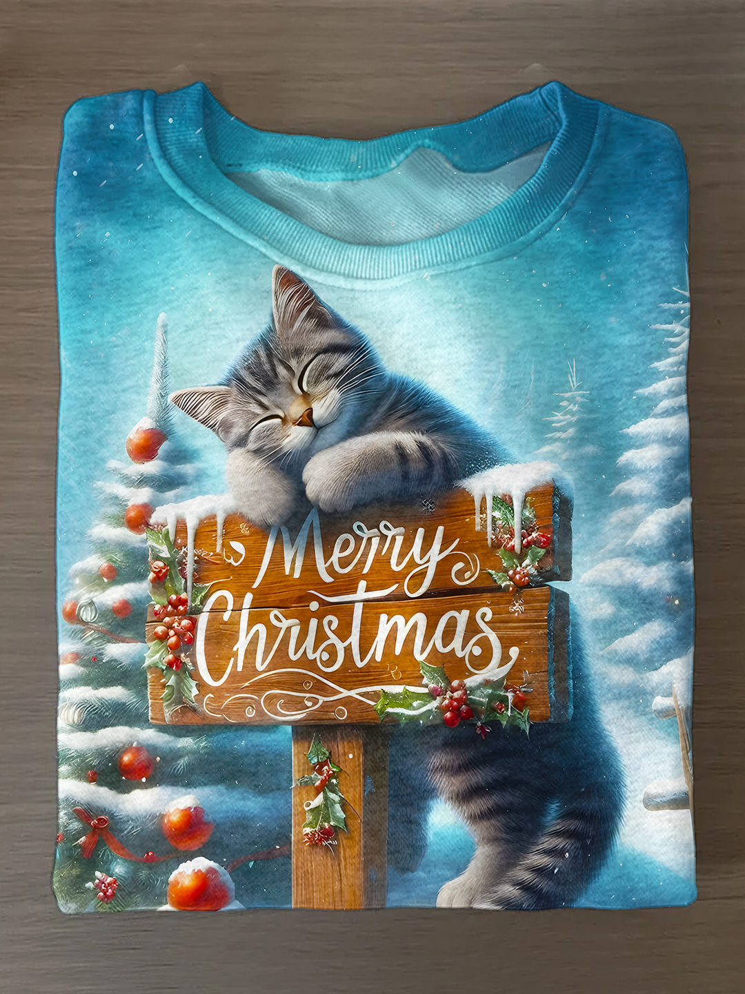Merry Christmas Cute Cat Printed Long Sleeve Casual Top