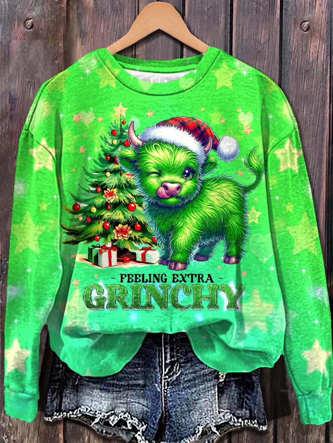 Christmas Grinch Highland Cow Print Long Sleeve Casual Top