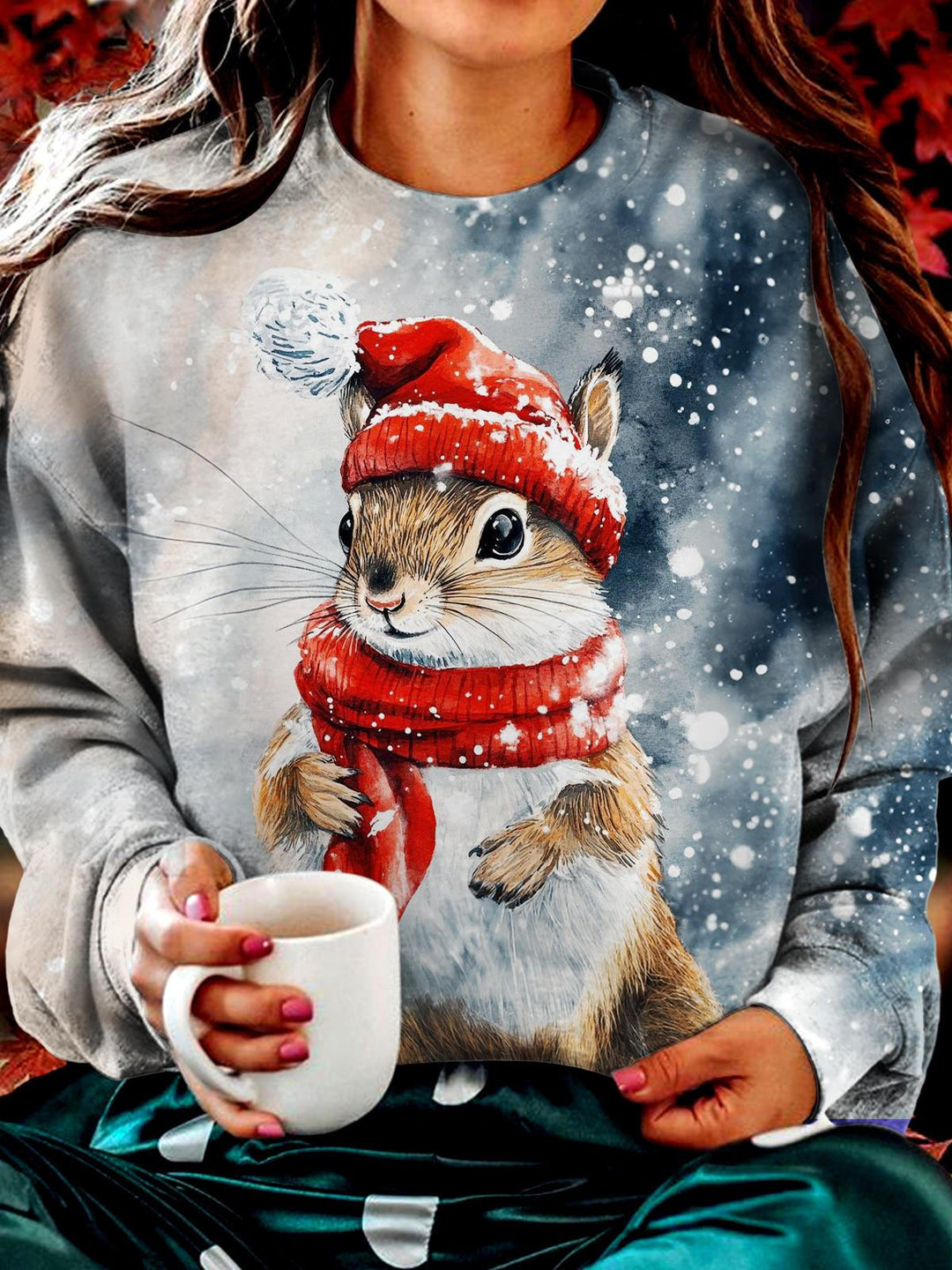 Winter Snow Forest Rabbit Printed Long Sleeve Casual Top