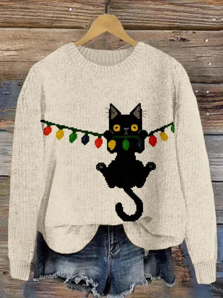 Women's Funny Christmas Cat Pattern Art Print Casual Cotton Sweater