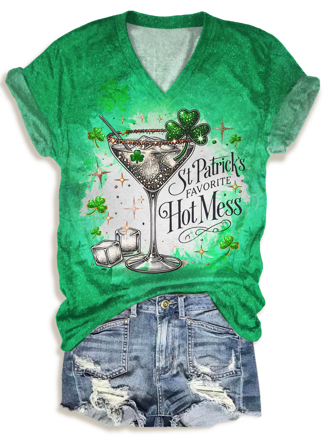 St Patrick's Hot Mess Funny Glitter Shamrock Beer V-neck T-Shirt