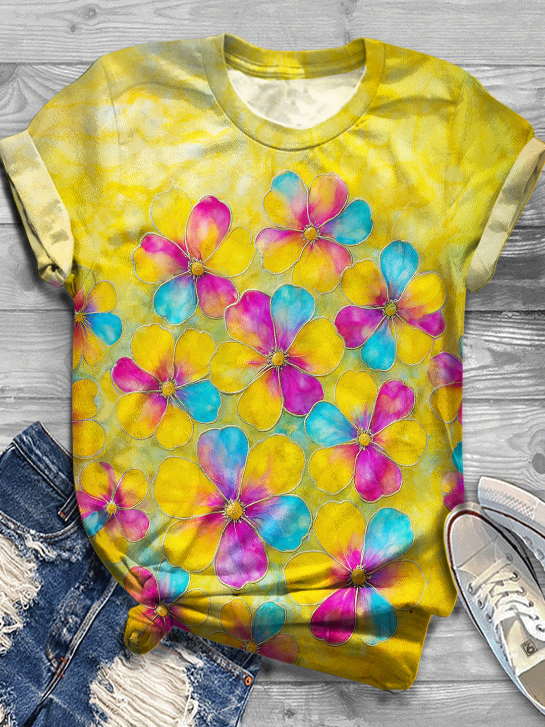 Retro Tie-dye Sunflower Cute Cat Crew Neck T-shirt