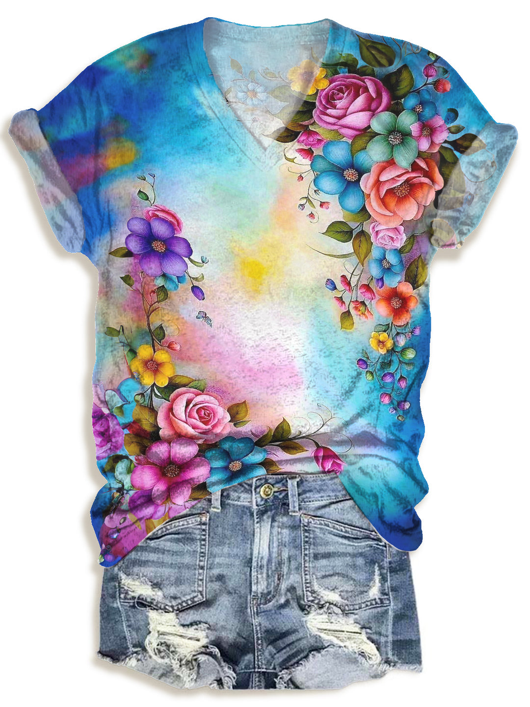 Butterfly Dyeing Short Sleeve V Neck Maxi Dress