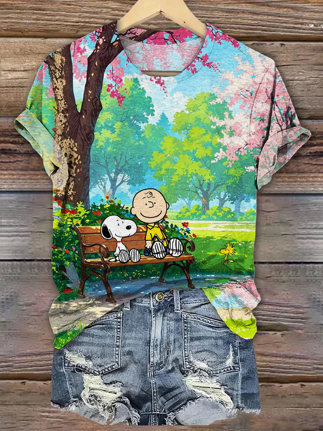 Snoopy Under Cherry Spring Blossom Tree Crew Neck T-shirt
