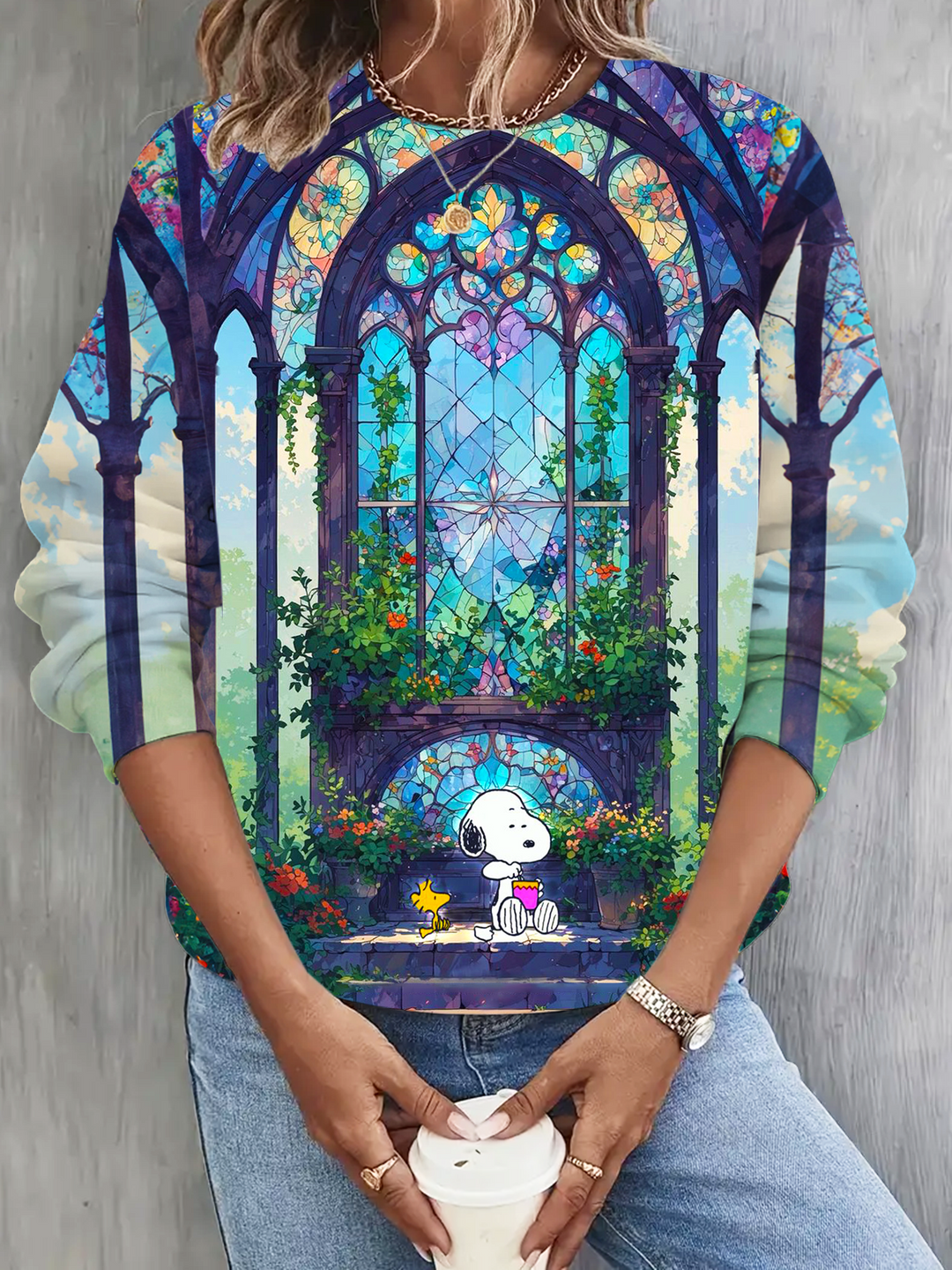 Snoopy in a Fun Stained Glass Garden Long Sleeve Casual Top