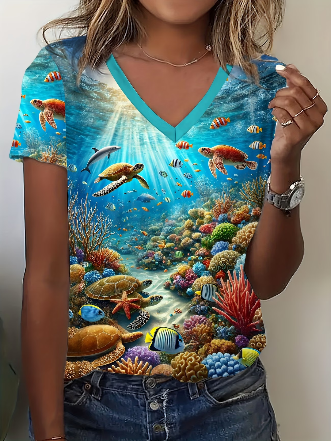 Dreamy Purple Turtle Print V-Neck Long Sleeve Top