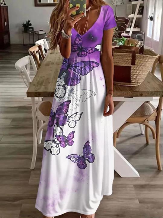 Butterfly Dyeing Short Sleeve V Neck Maxi Dress