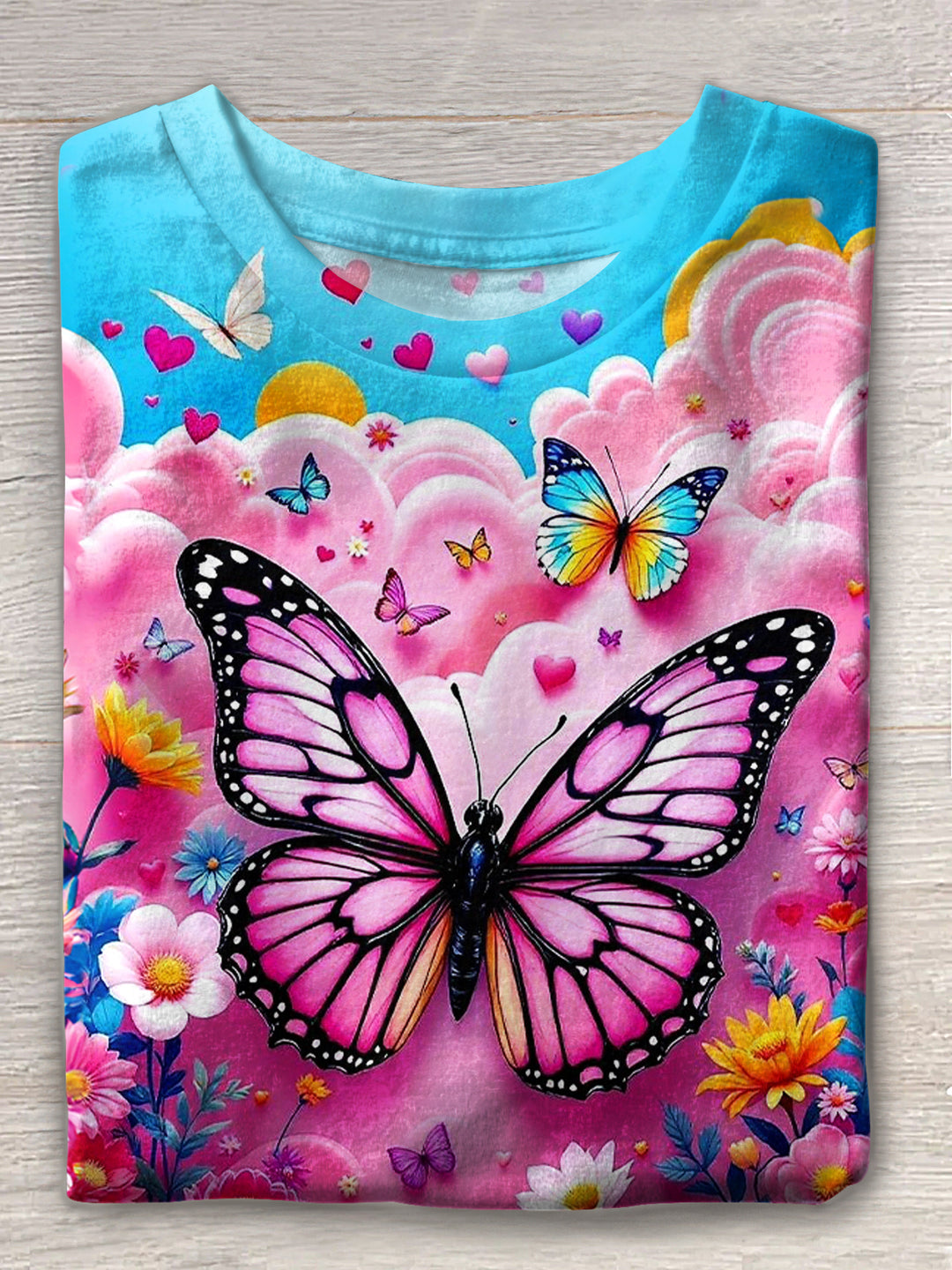 Abstract Floral Butterfly Print Crew Neck T-shirt