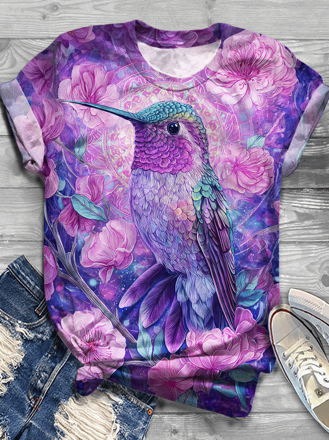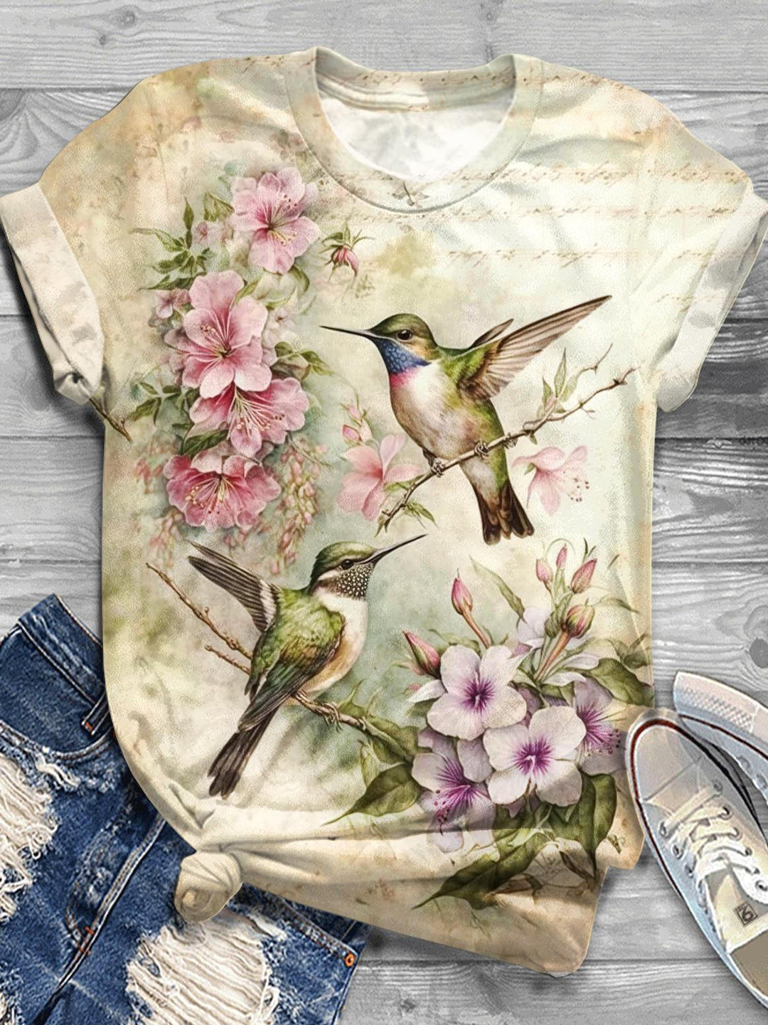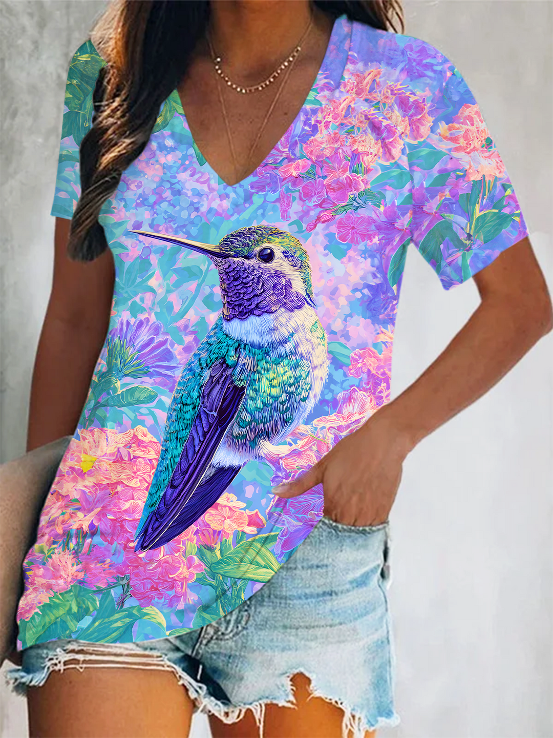 Colorful Flowers And Hummingbirds Short Sleeve V Neck Print Top