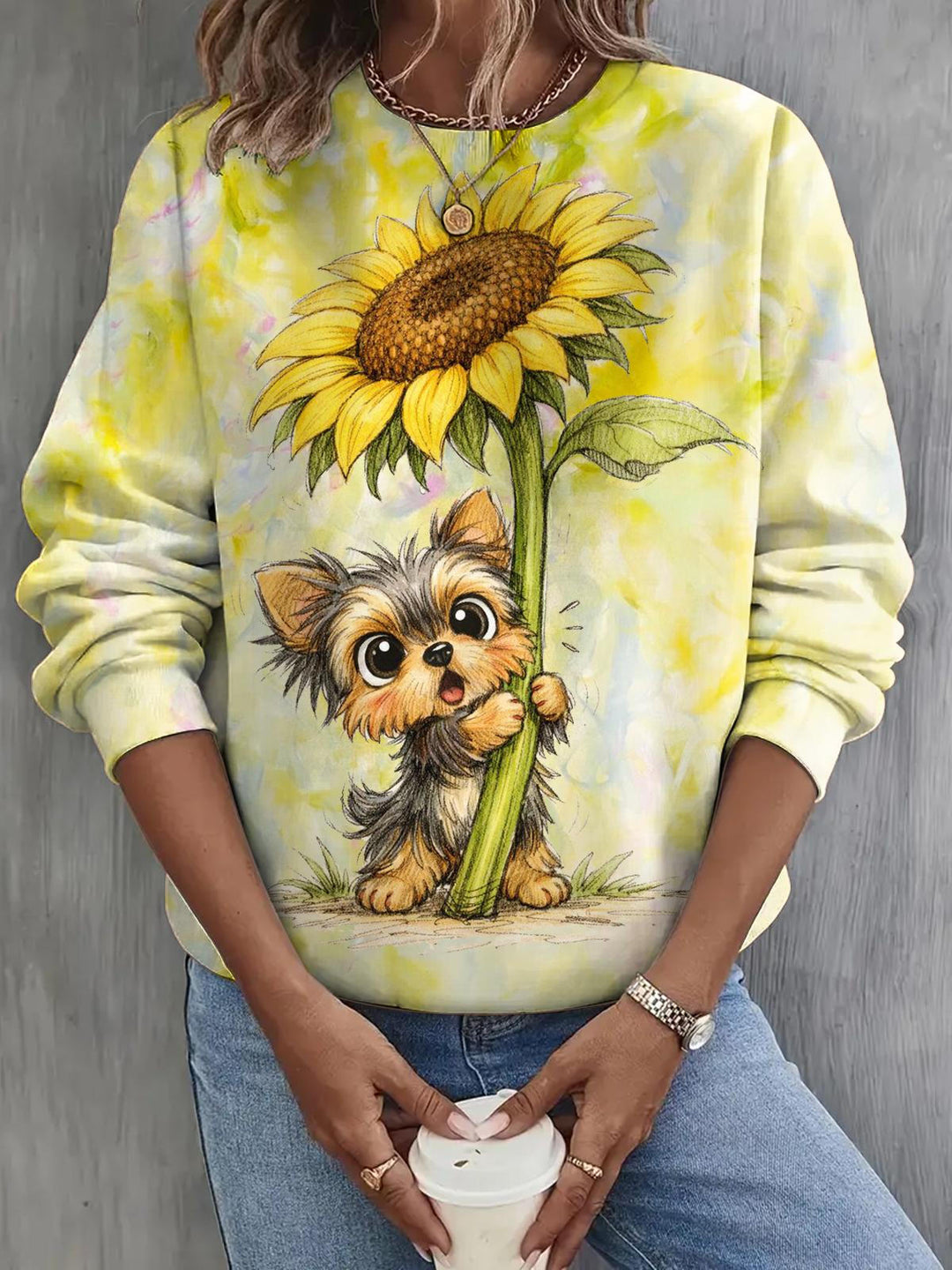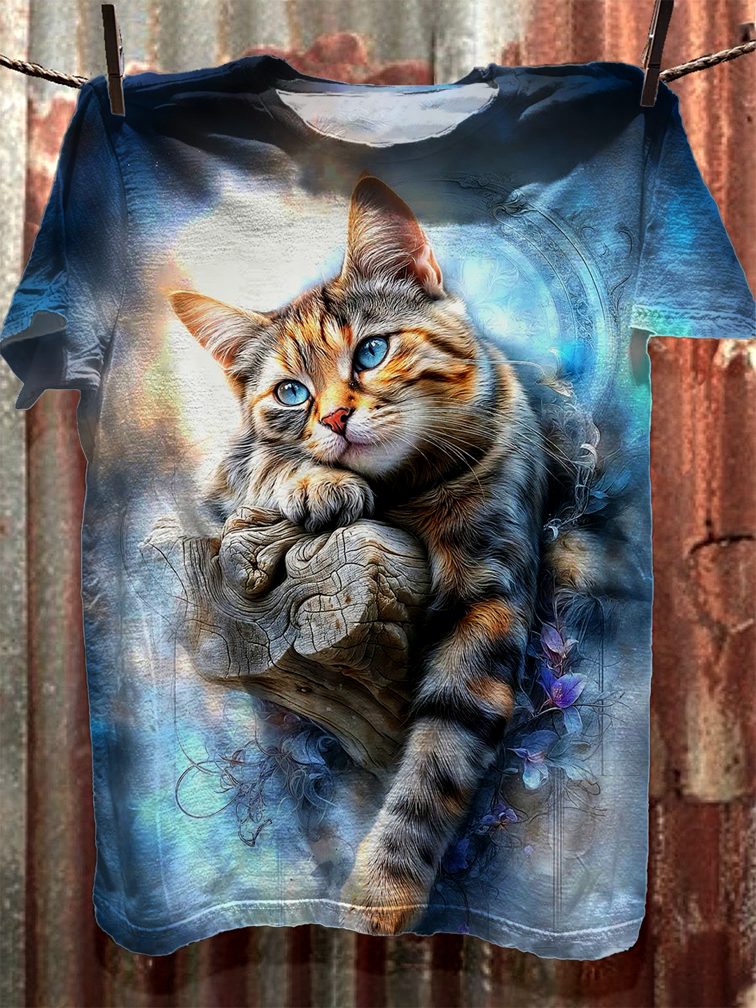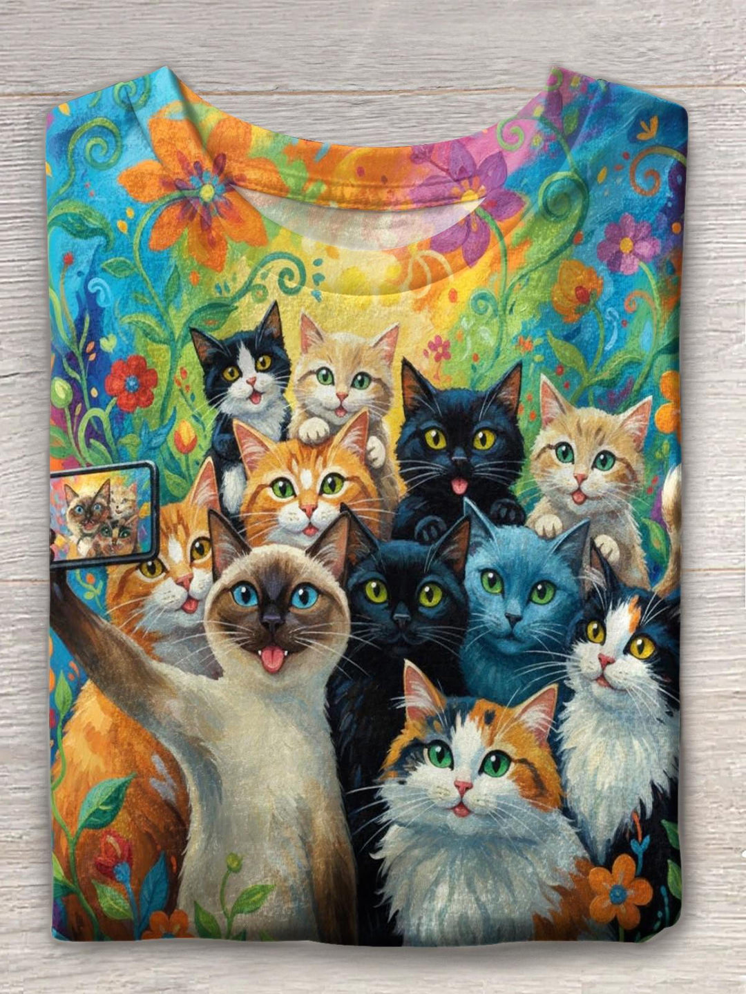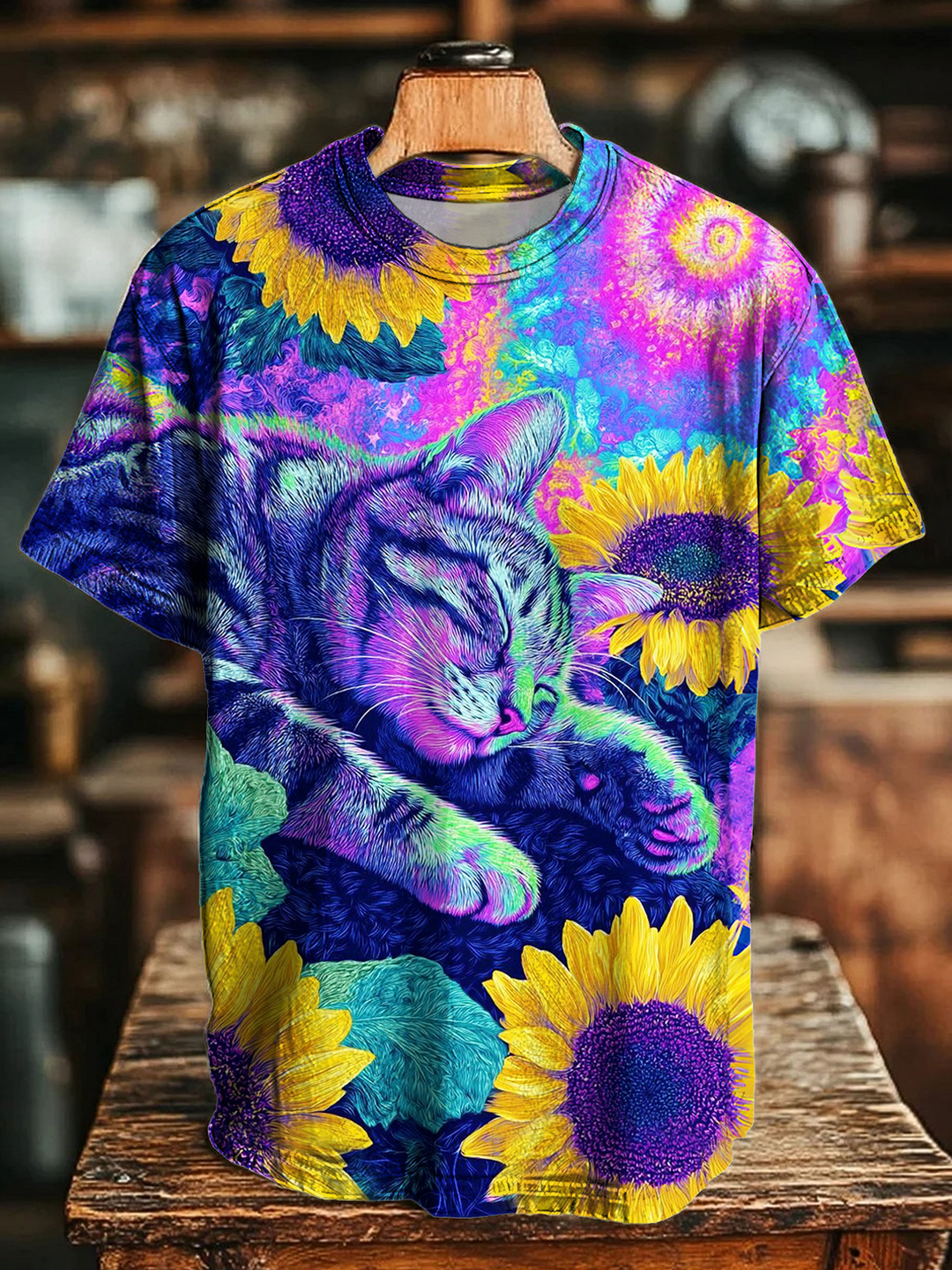 Retro Tie-dye Sunflower Cute Cat Crew Neck T-shirt