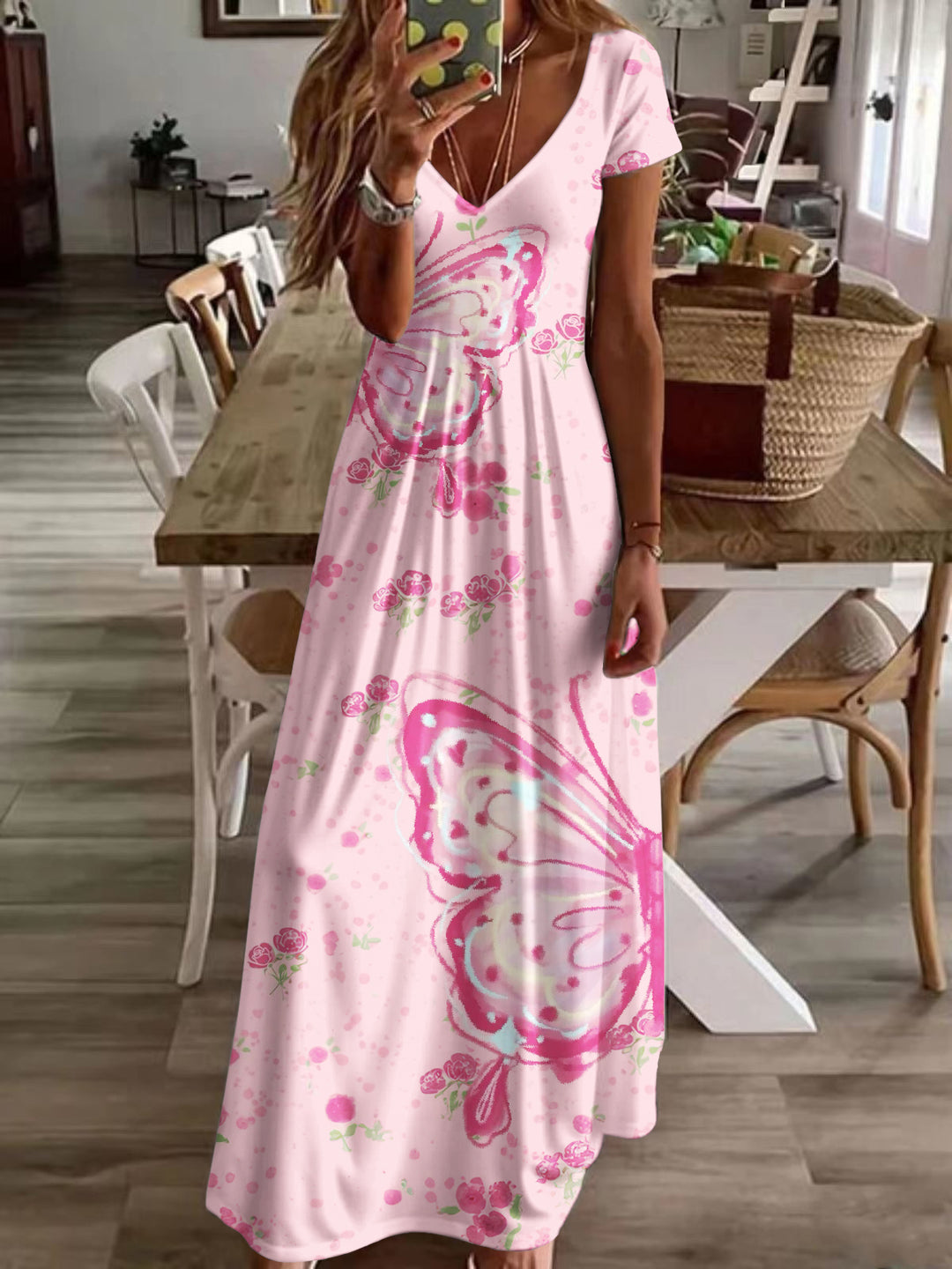 Irregular Butterfly Short Sleeve V Neck Maxi Dress