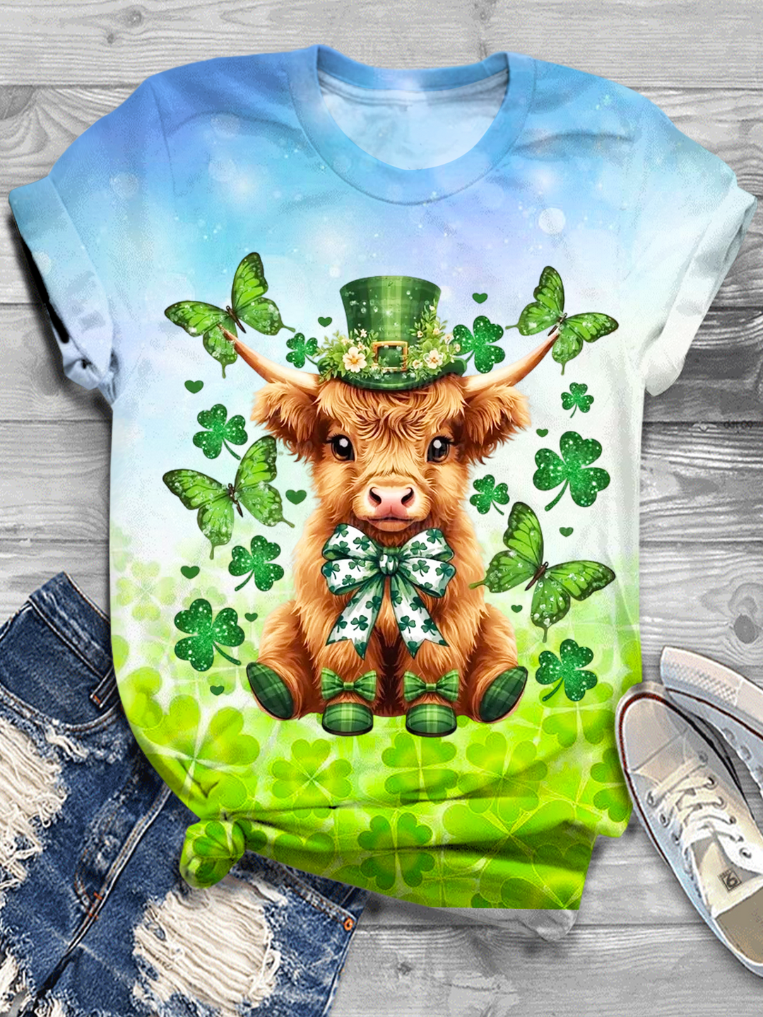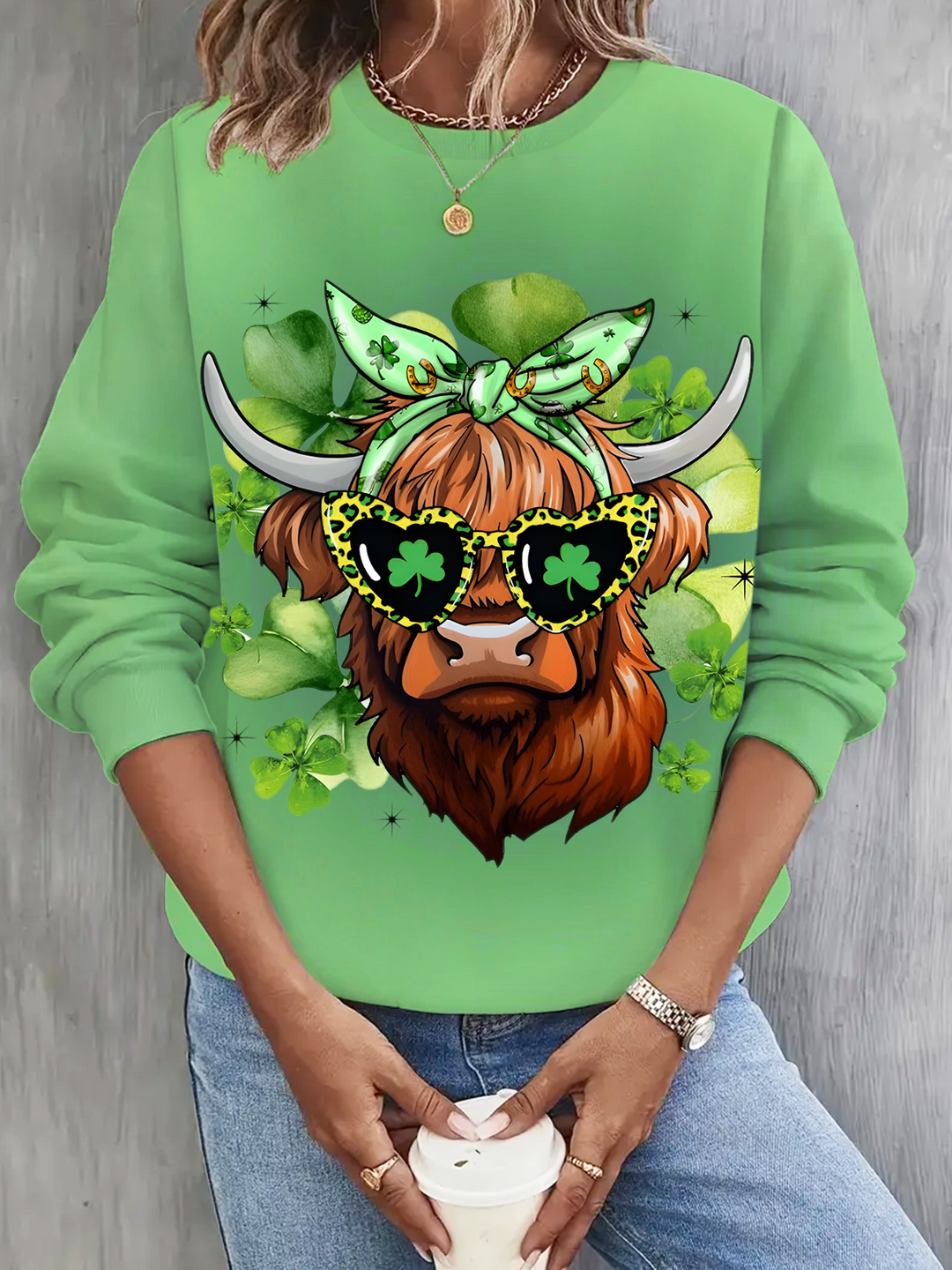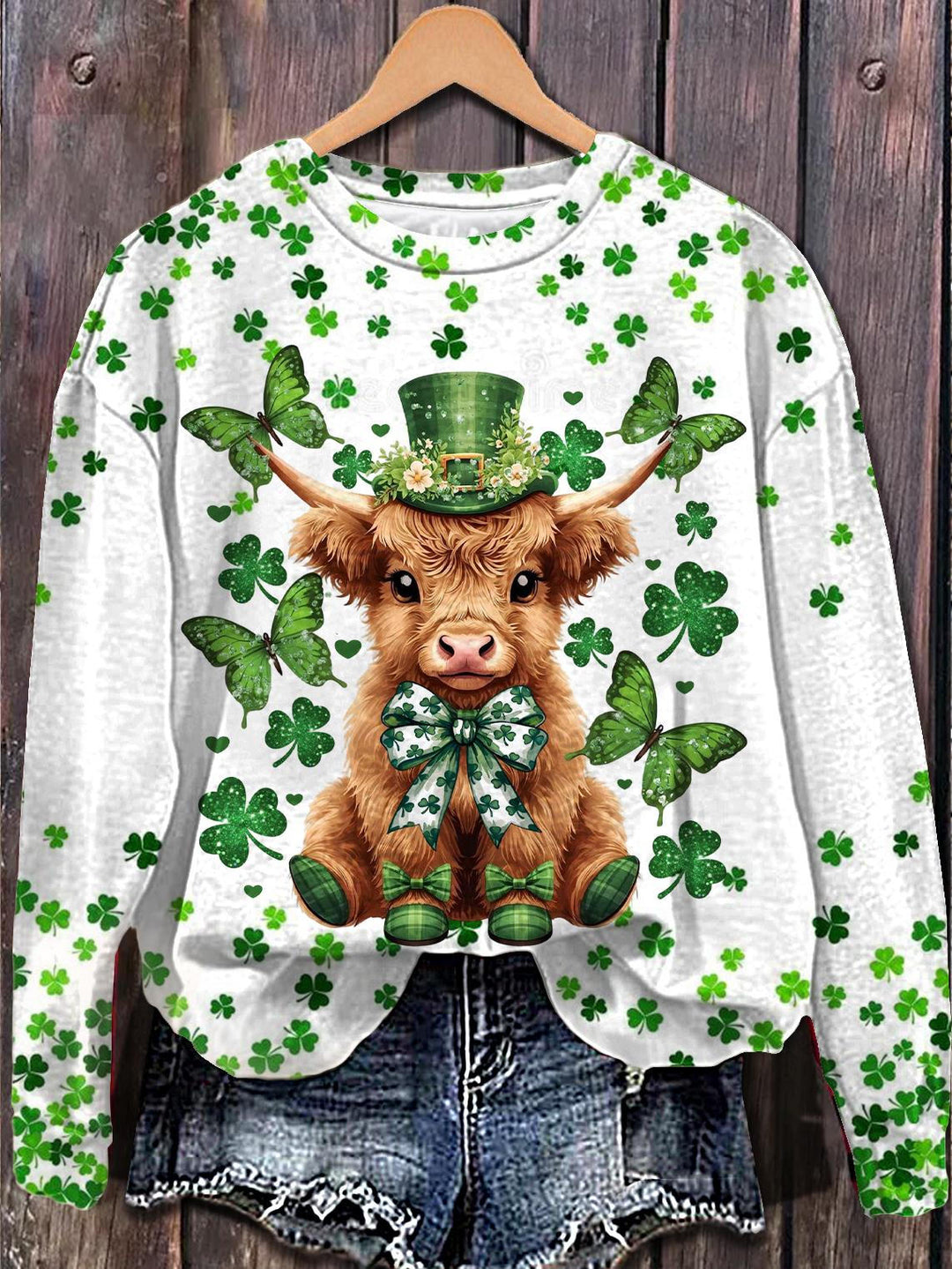 St. Patrick's Day Highland Cattle Printed Long Sleeve Casual Top