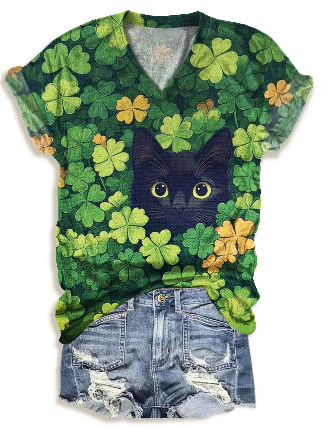 St. Patrick's Day Clover Butterfly Art Short Sleeve V Neck Print Top