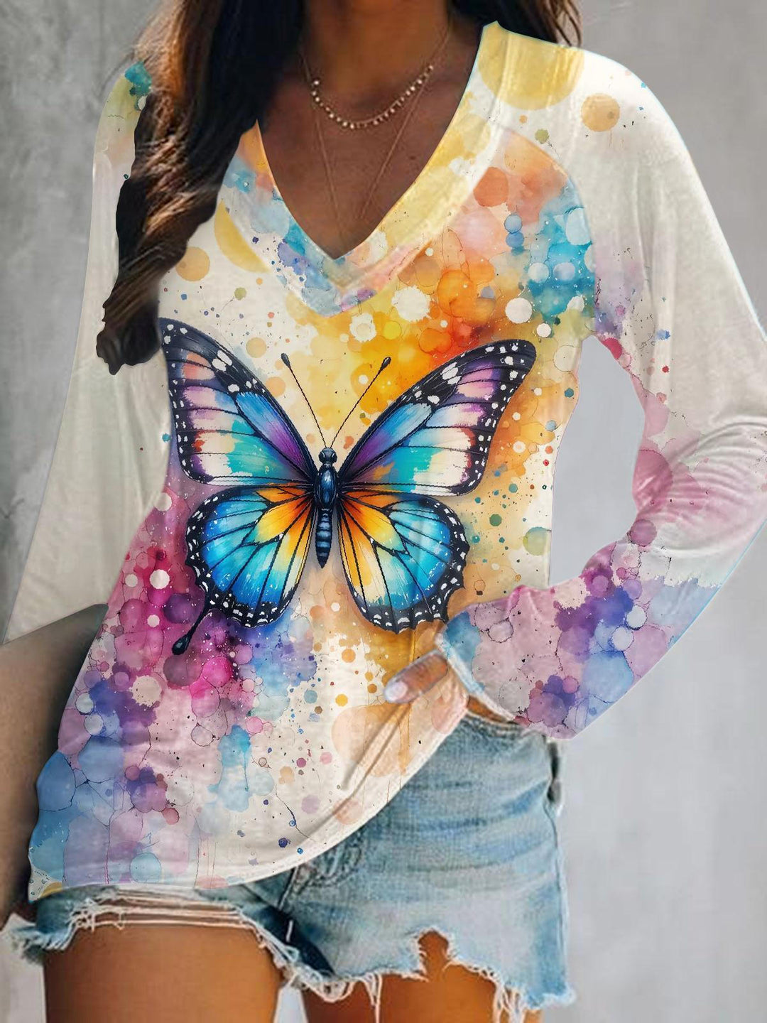 Colorful Butterfly Art Print V-Neck Long Sleeve Top