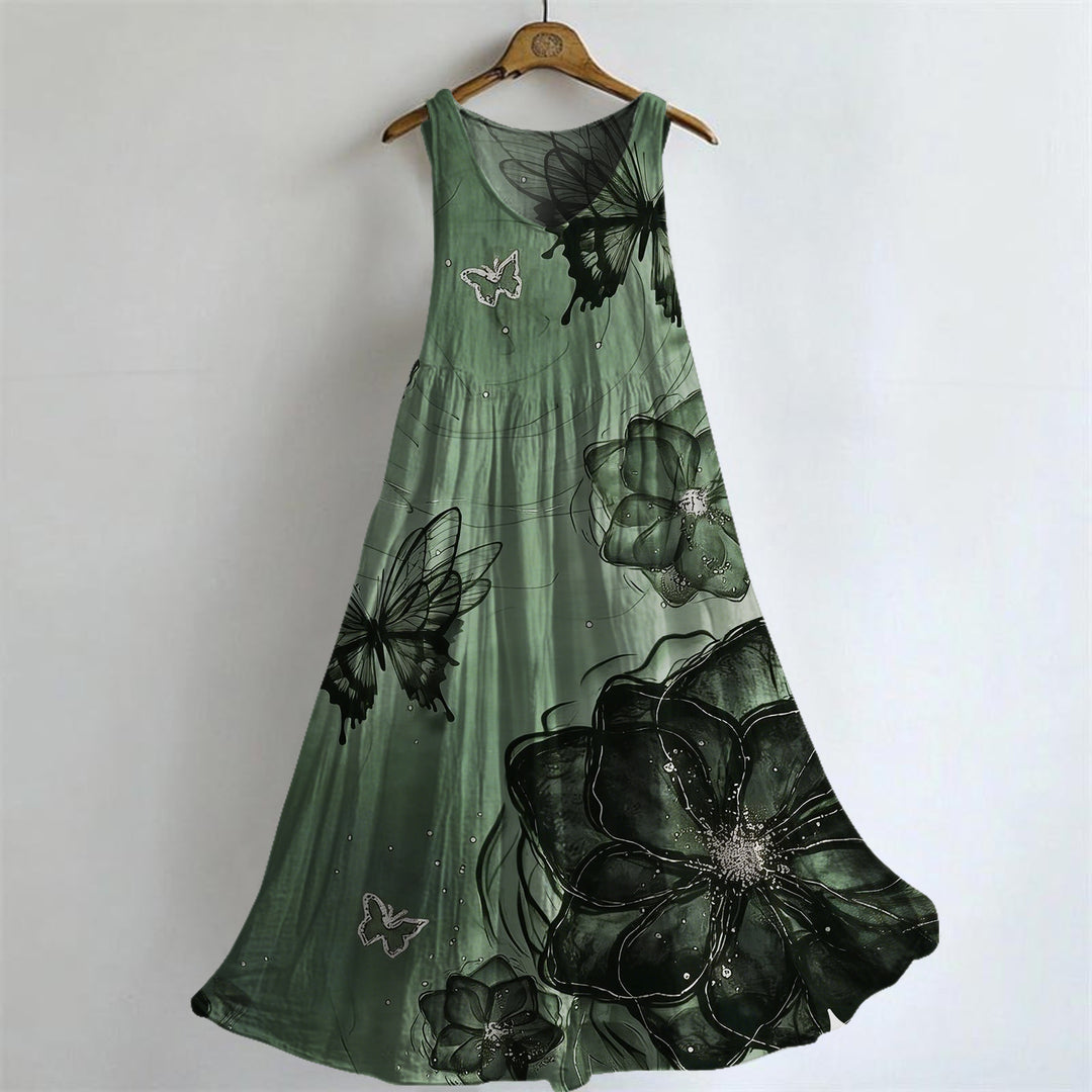 Retro Butterfly Flowers Exquisite Hemp Sleeveless V-Neck Dress