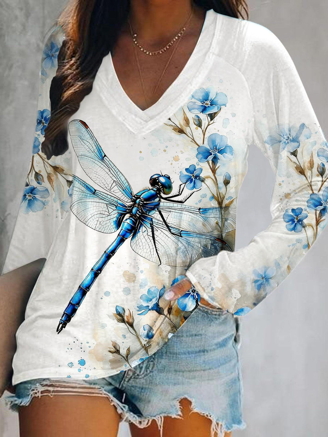Chinese Style Dragonfly Print V-Neck Long Sleeve Top