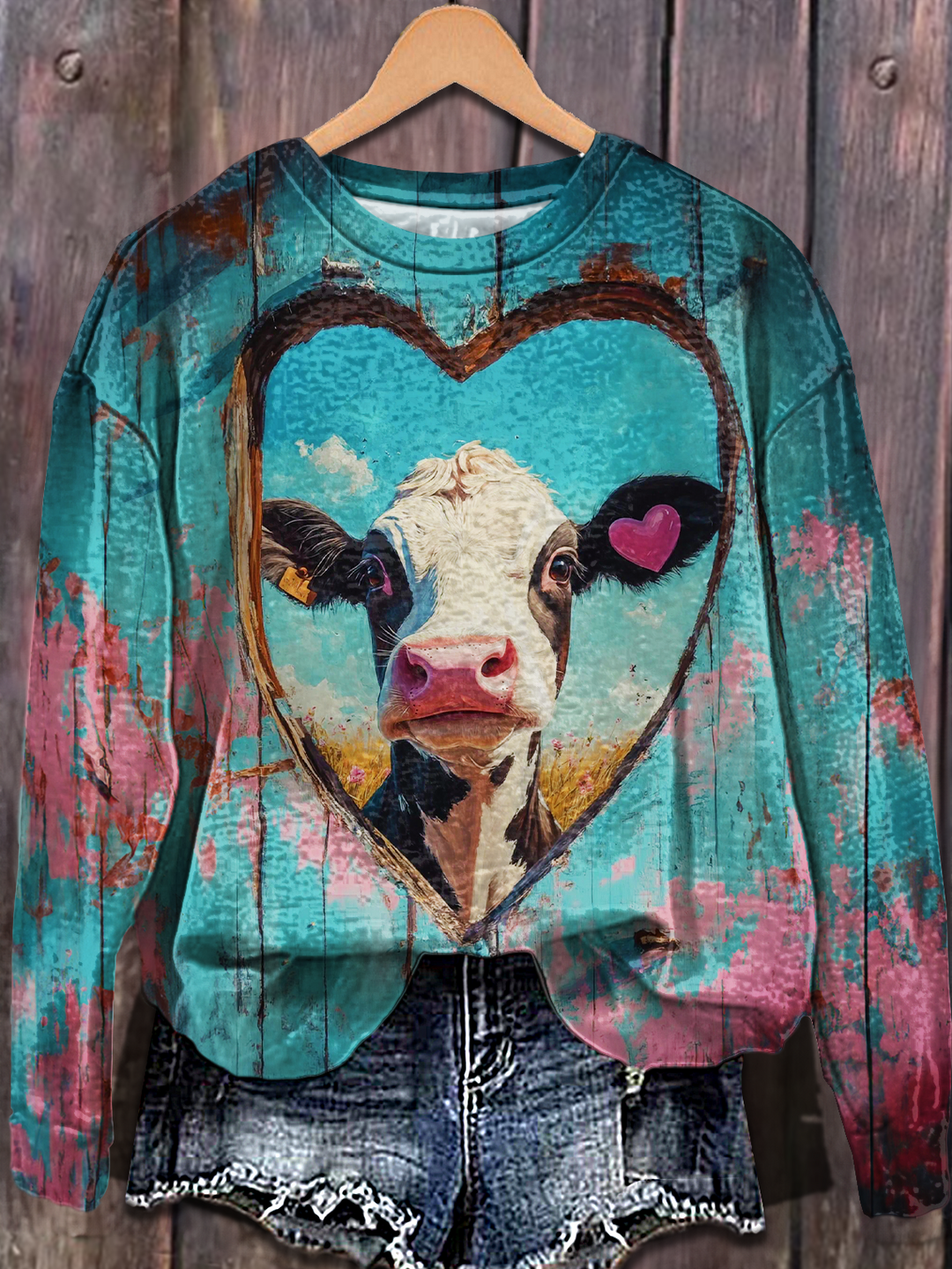 Vintage Valentine Cute Cow Printed Long Sleeve Casual Top
