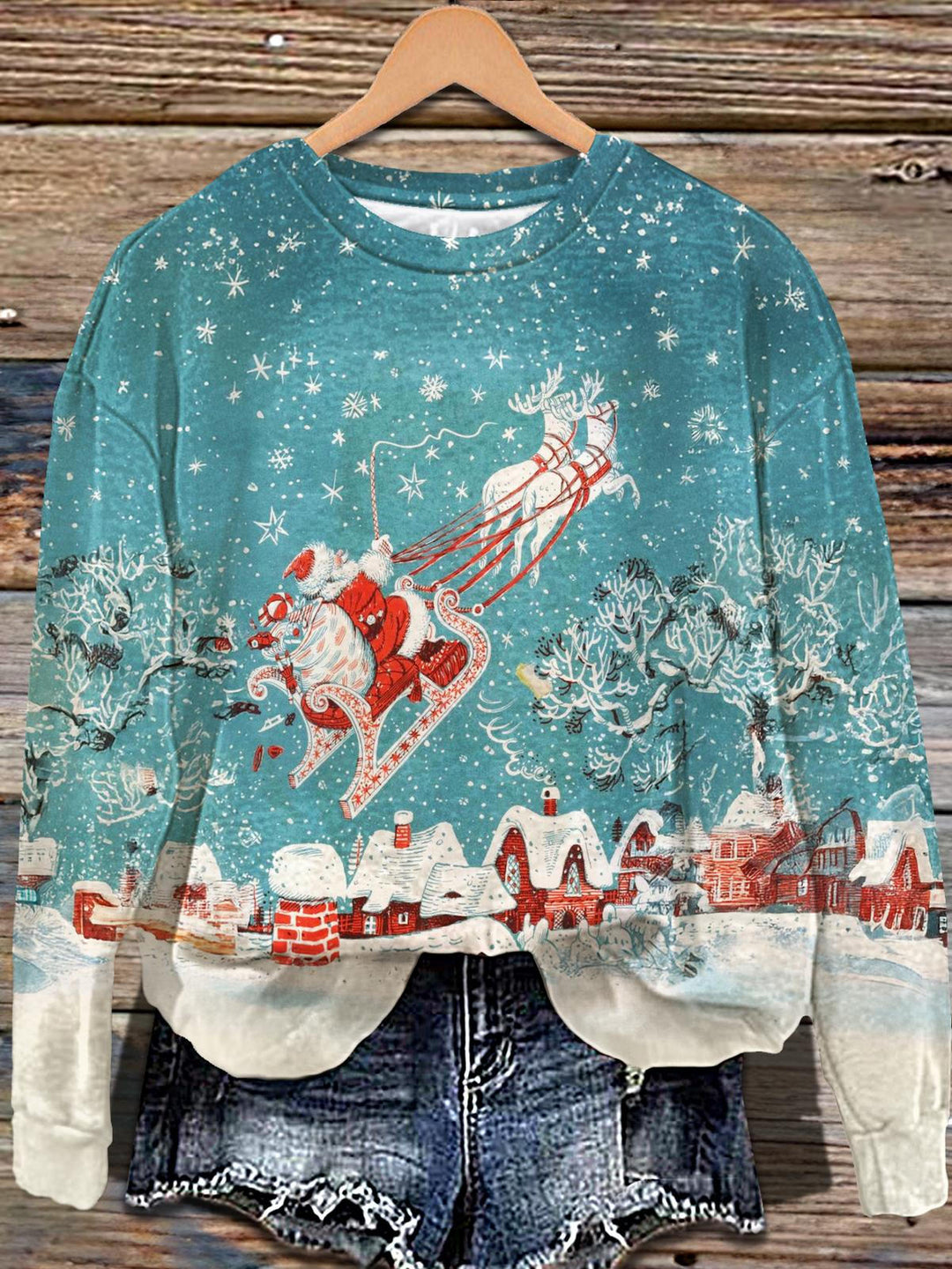 Santa Claus Illustration Printed Long Sleeve Casual Top