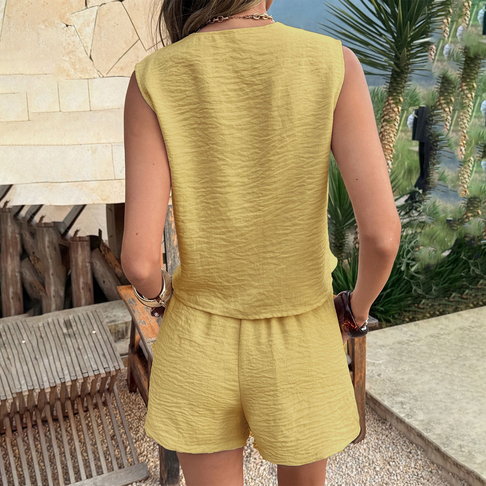 The Summer Tie Front Sleeveless Tank Top and Shorts Loungewear Set is designed for comfort and style during warm weather activities. This loungewear set features a sleeveless tank top with an adjustable tie-front design, paired with matching shorts for effortless relaxation. Ideal for vacation, beach outings, and travel, it combines functionality with leisure appeal. The breathable fabric ensures all-day comfort, making it suitable for daily wear while maintaining a casual yet chic look.