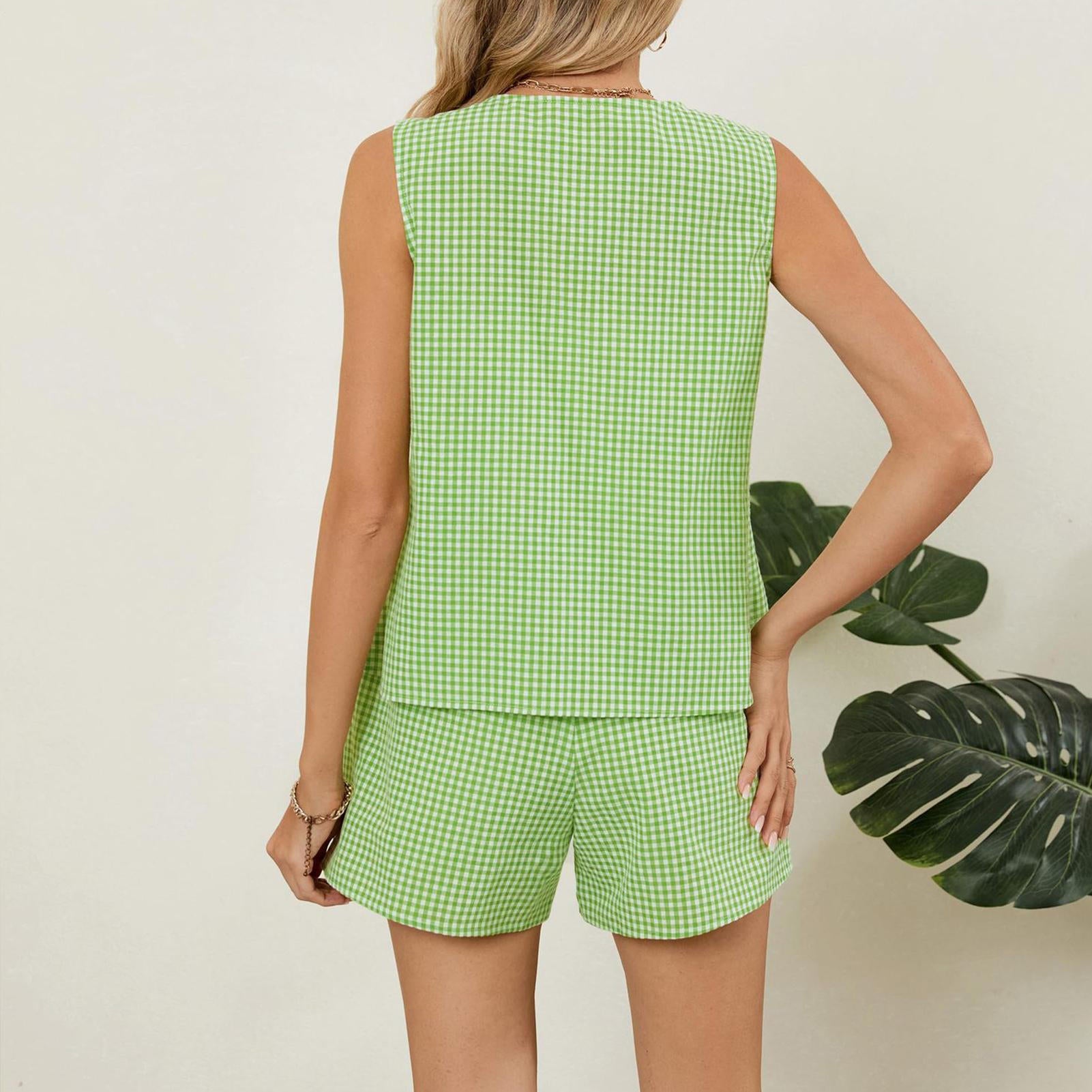 2 Piece Shorts Set for Women Plaid Print Button Down Tank Top and Shorts Outfits Summer Loungewear for Travel compatible