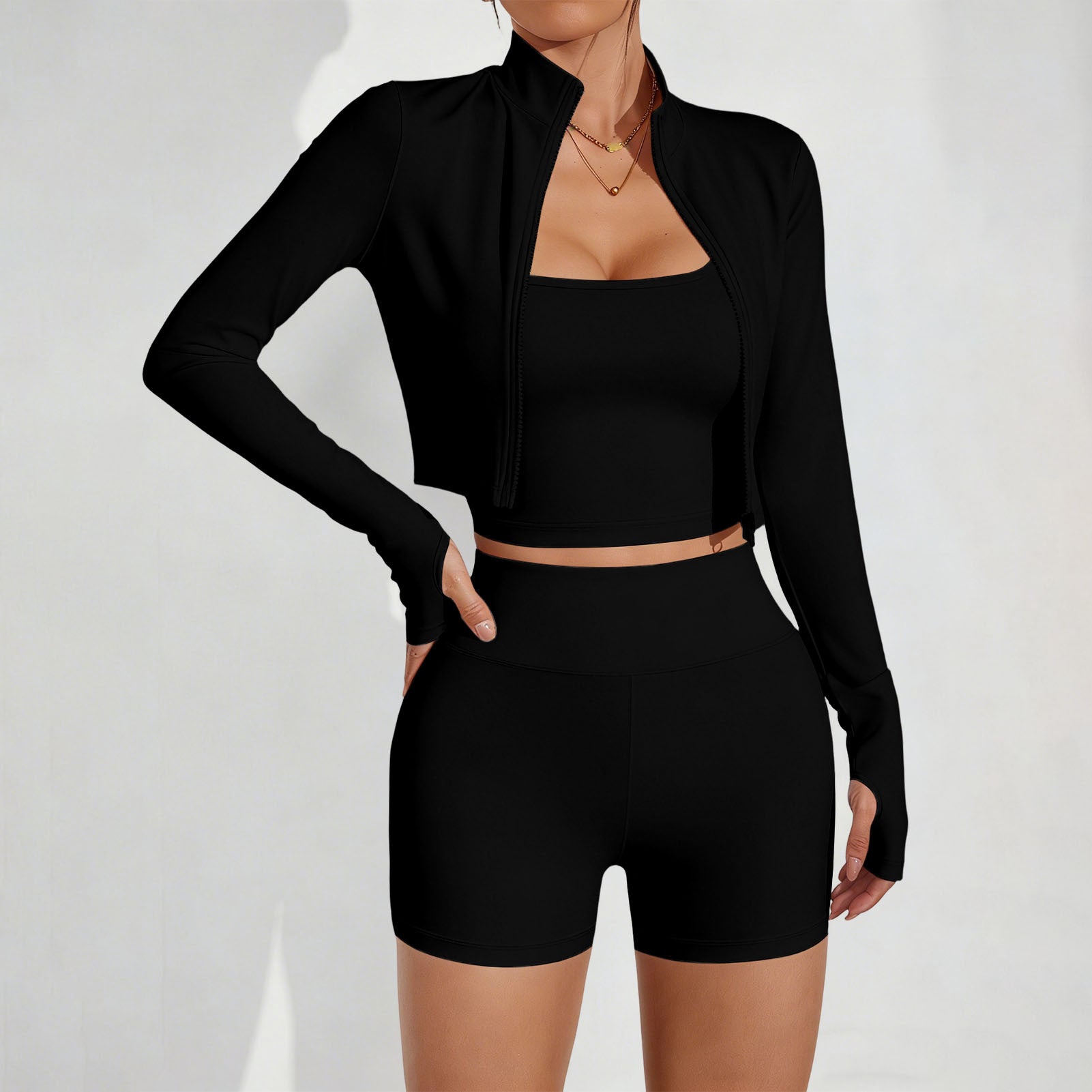 Elevate your activewear collection with our High Waisted Shorts, Camisole Top, and Jacket Workout Sets, designed for versatility and comfort during gym workouts, exercise routines, or daily activities. The high-waisted shorts provide a secure fit, while the camisole top ensures breathability and ease of movement. Pair these with the matching jacket to complete a stylish athletic look. Suitable for indoor workouts, outdoor fitness activities, or casual wear, this set combines functionality with modern design. Enhance your performance and style effortlessly with this workout set, crafted for active individuals seeking practicality and fashion in a single ensemble.