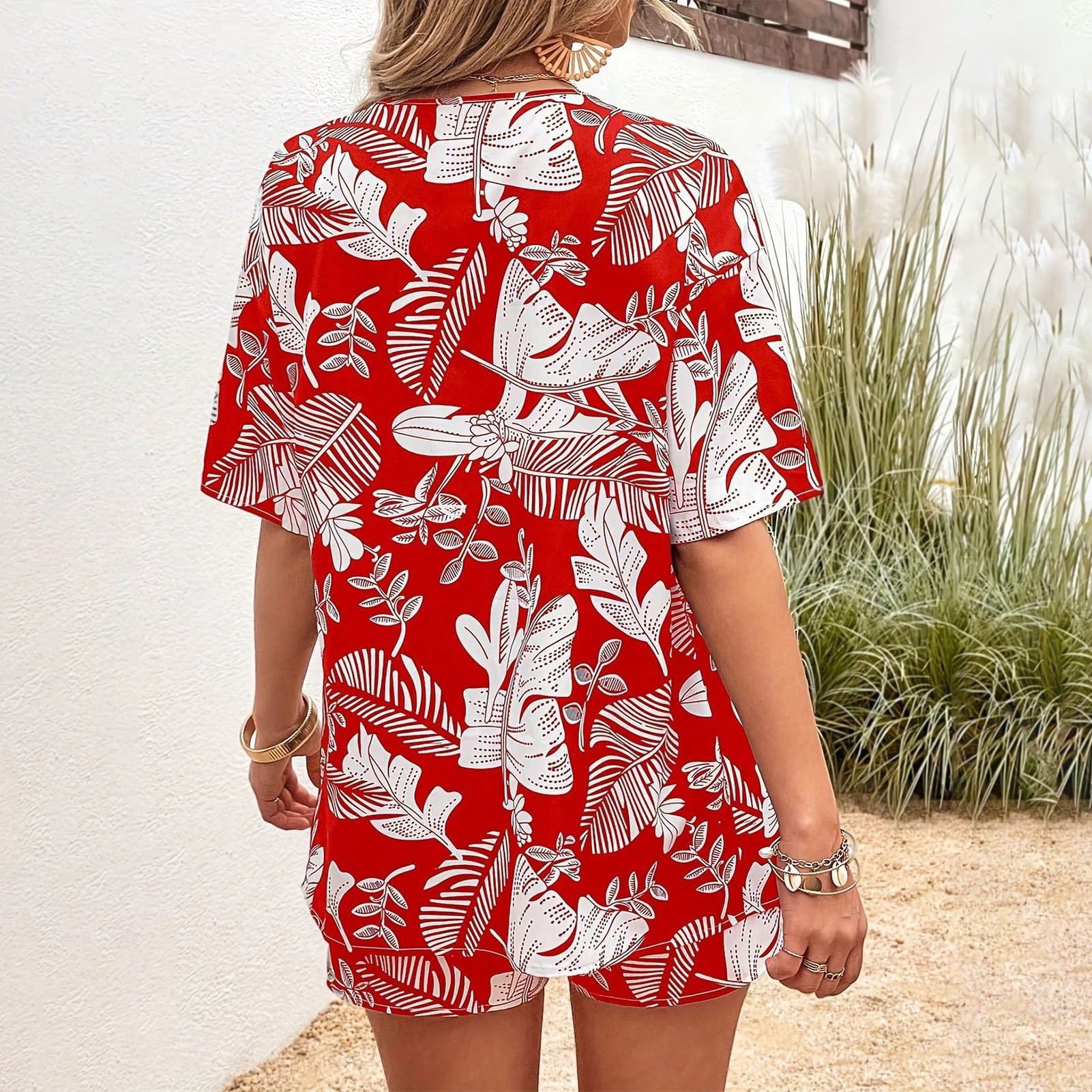 Beach 2 Piece Outfits for Women Boho Floral Leaf Summer Outfits Short Sleeve Shirt Beach Sets for Daily Wear favorable