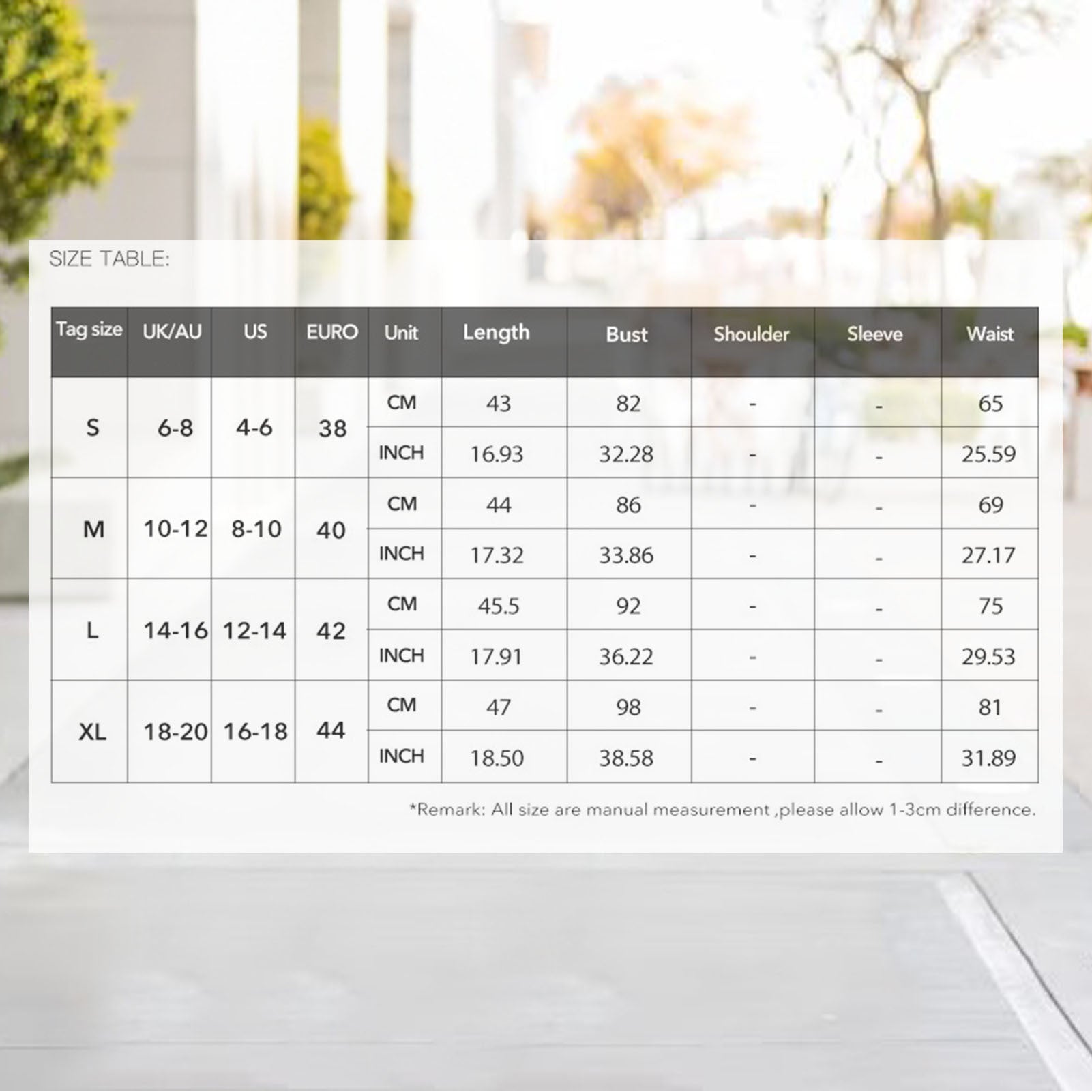 2. Due to different manual measurements, please allow a 1-2cm difference in size.