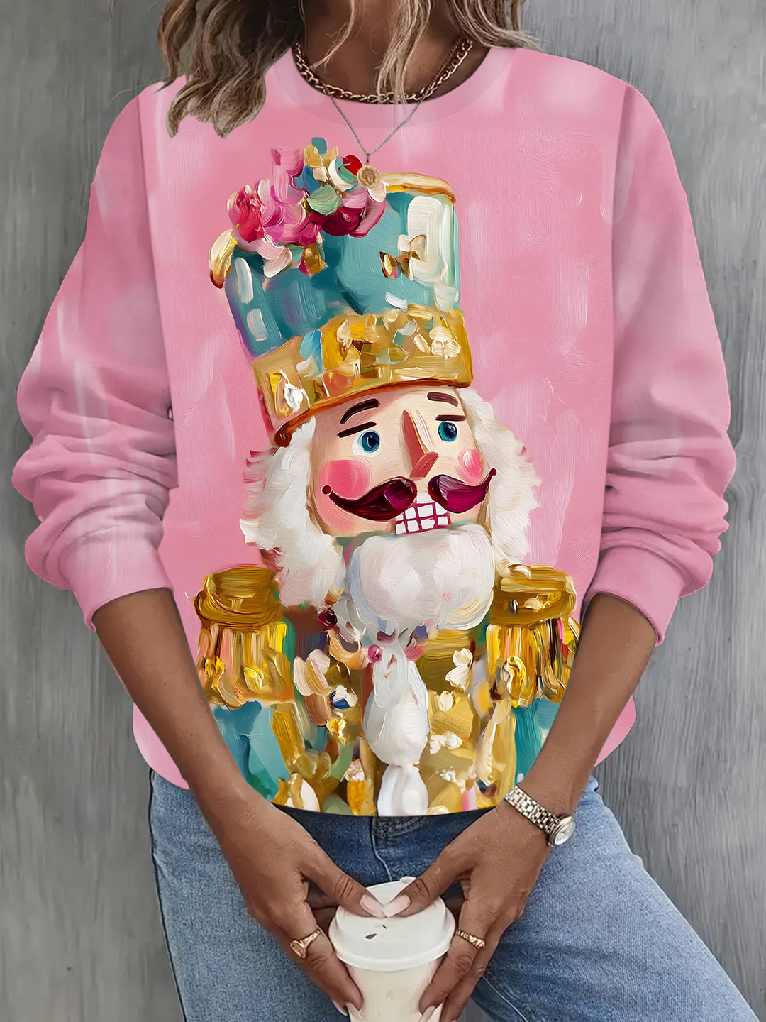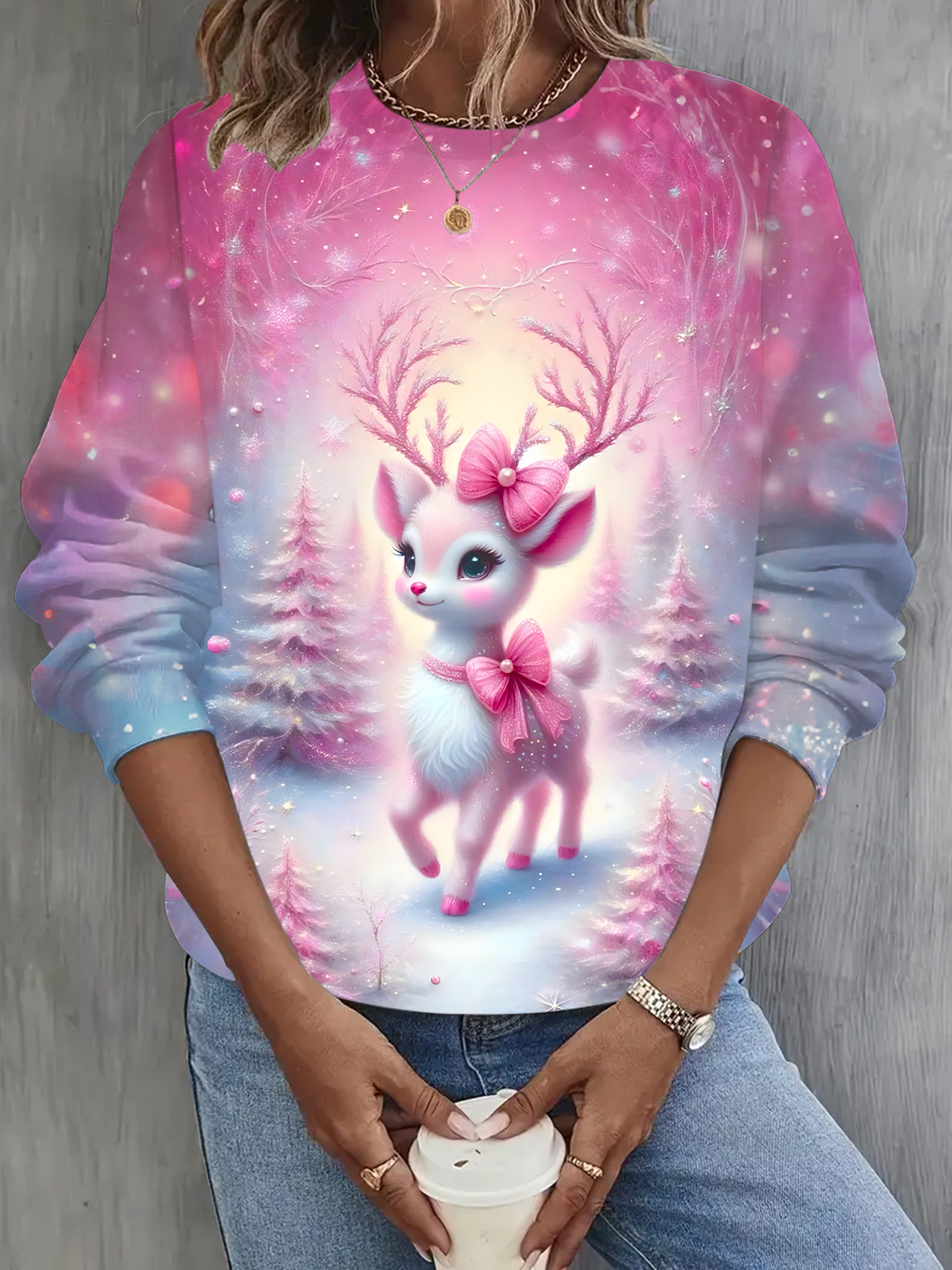 Pink Deer Crewneck Sweatshirt For Winter Long Sleeve Casual Top