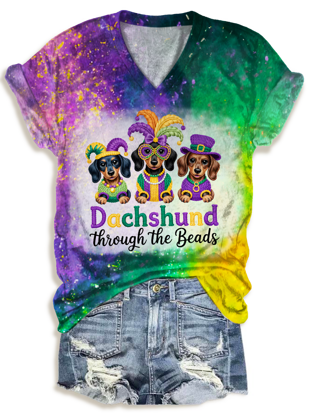 Mardi Gras Dachshund Print V-Neck T-Shirt
