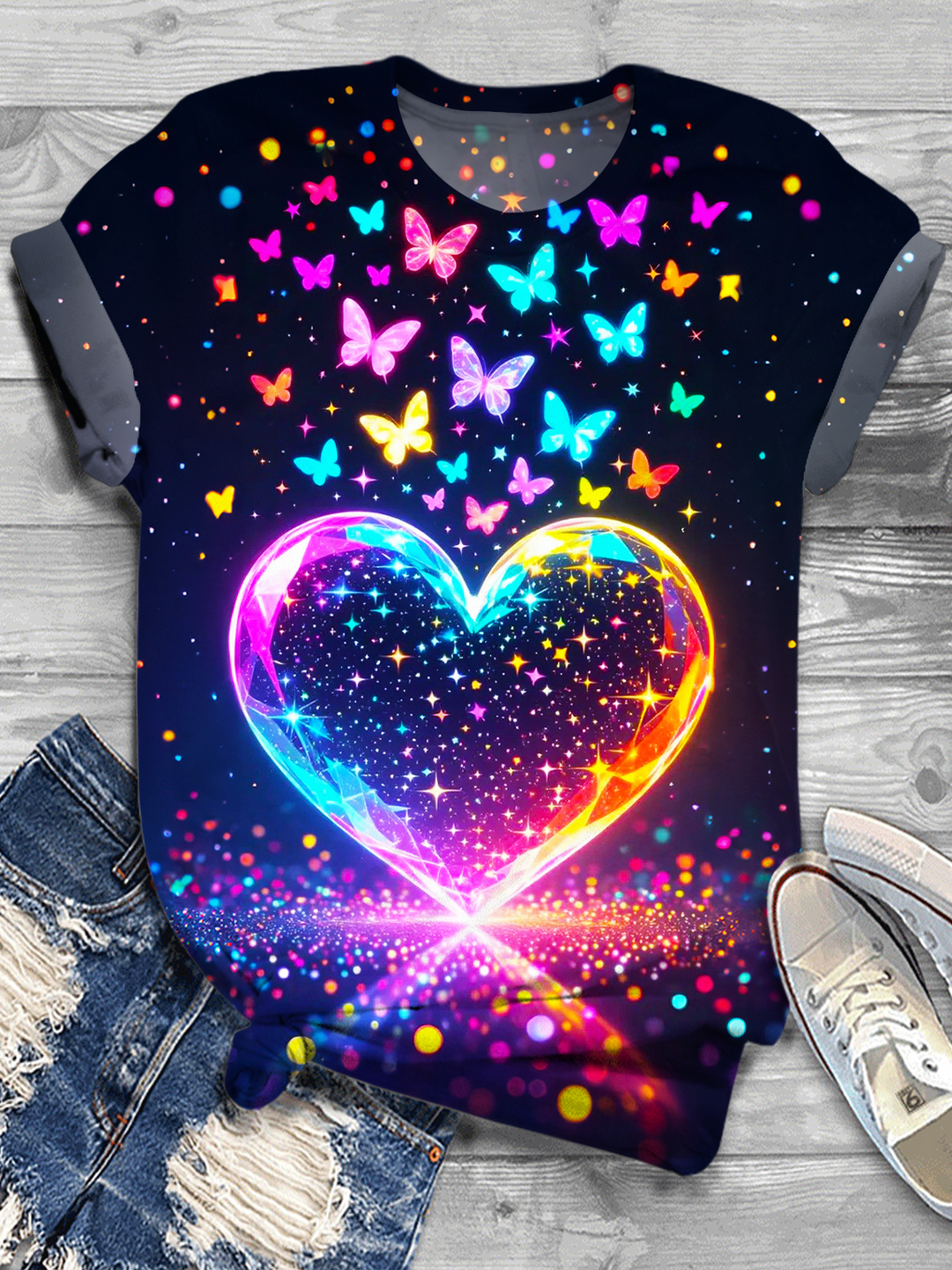 Colorful Butterfly And Heart Print Crew Neck T-Shirt