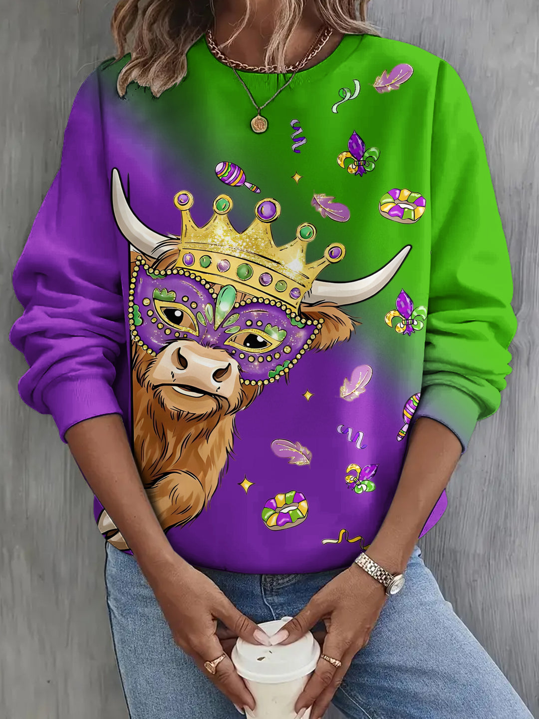 Mardi Gras Highland Cattle Long Sleeve Casual Top
