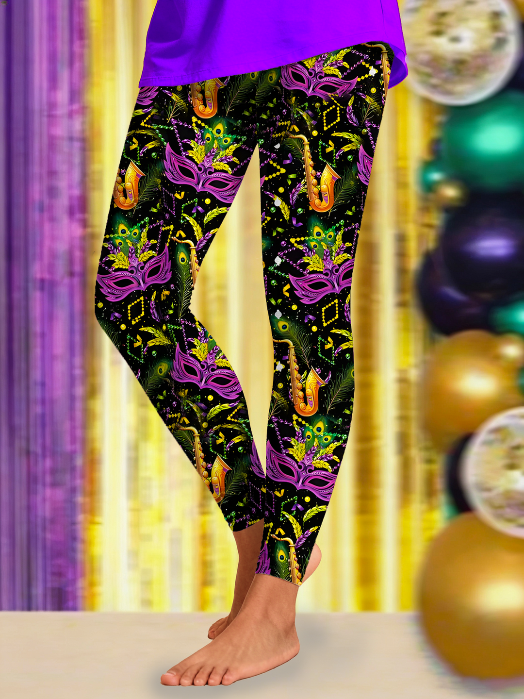 Mardi Gras Mask & Feathers Sax Print Leggings
