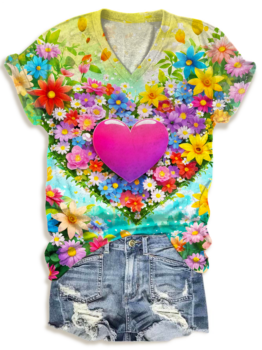 Colourful Flowers Blooming from a Spring Heart V-neck T-Shirt