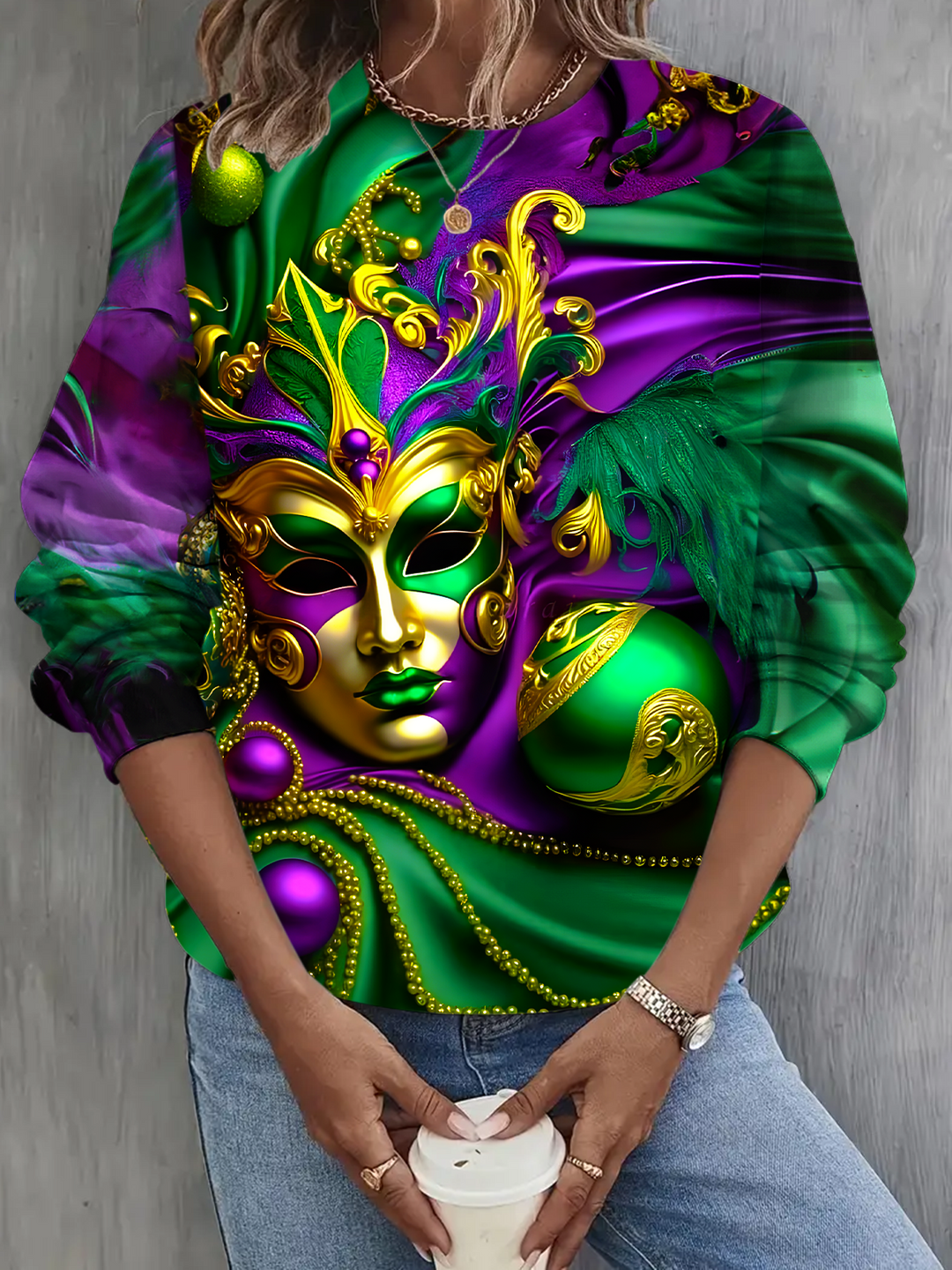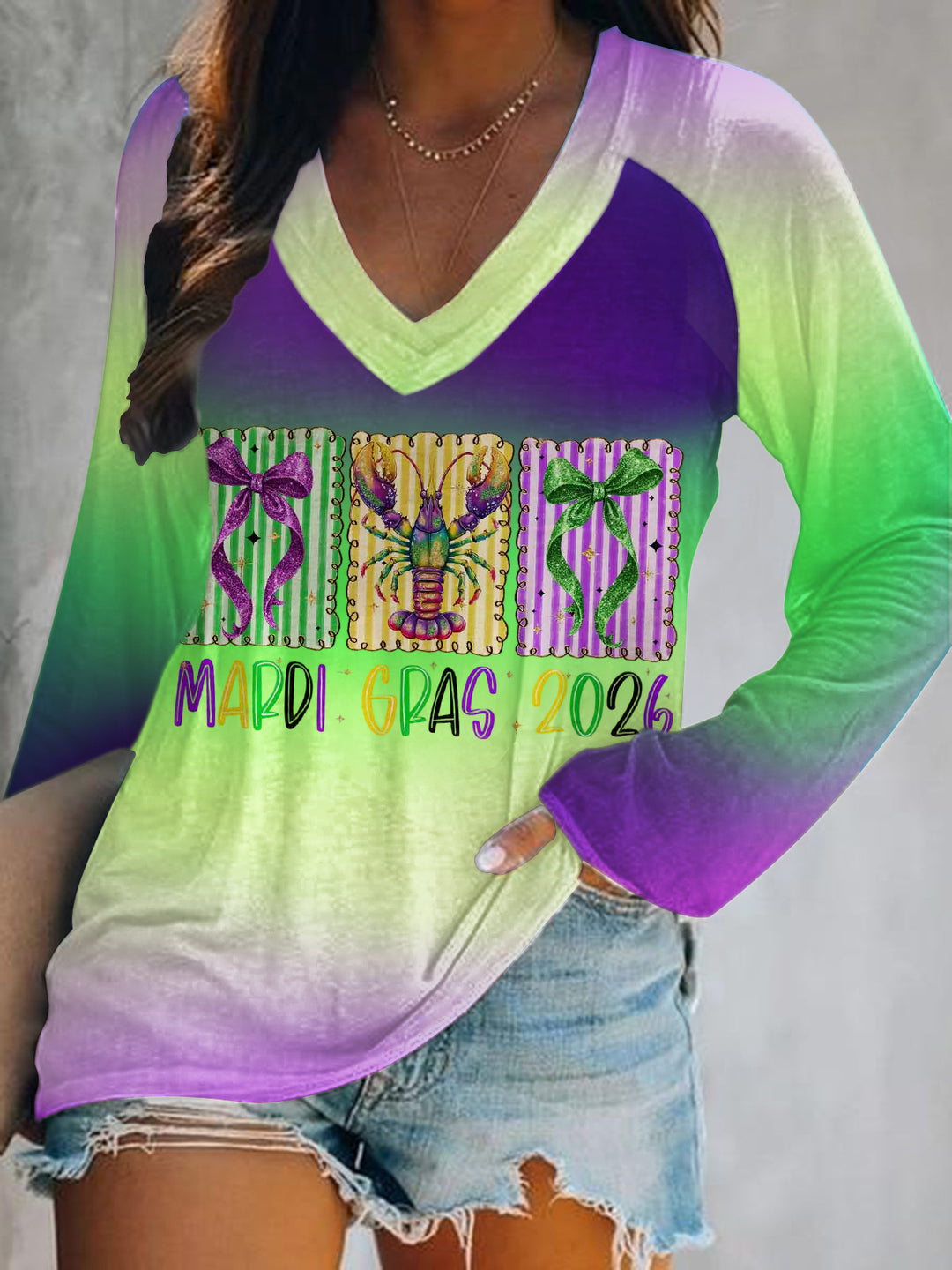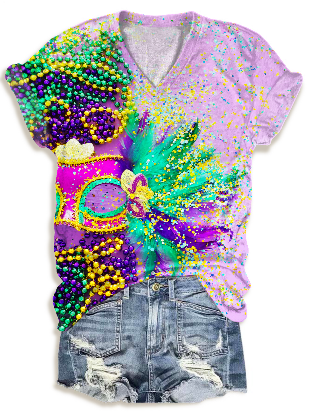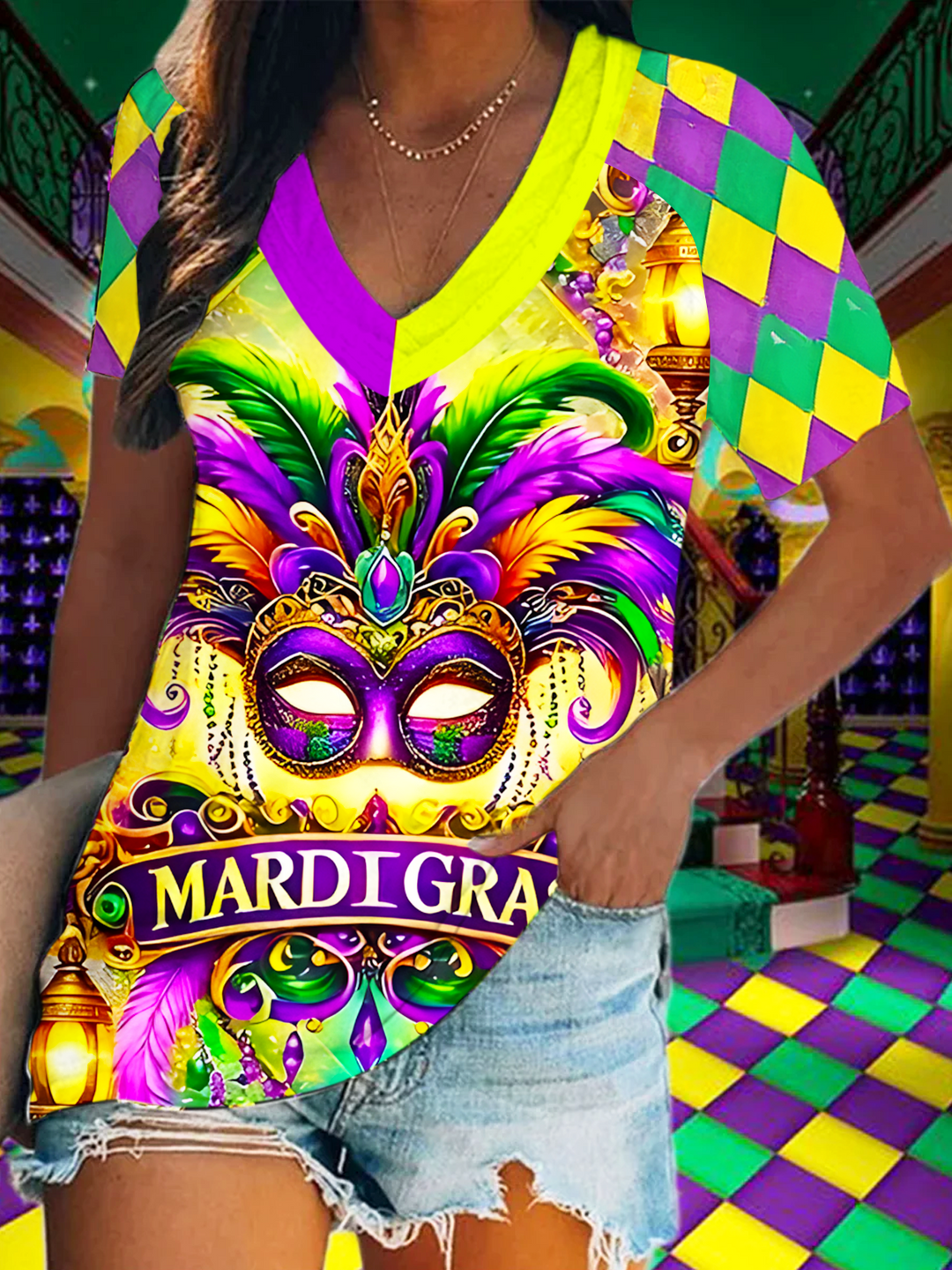 Mardi Gras Mask Short Sleeve V Neck Print Top
