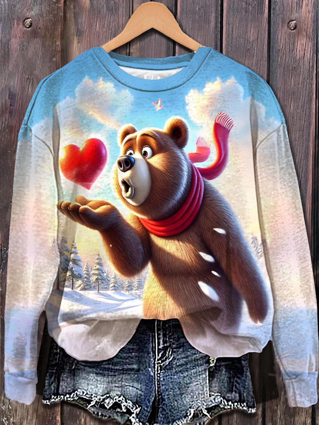 Winter Valentine's Day Bear Print Long Sleeve Casual Top