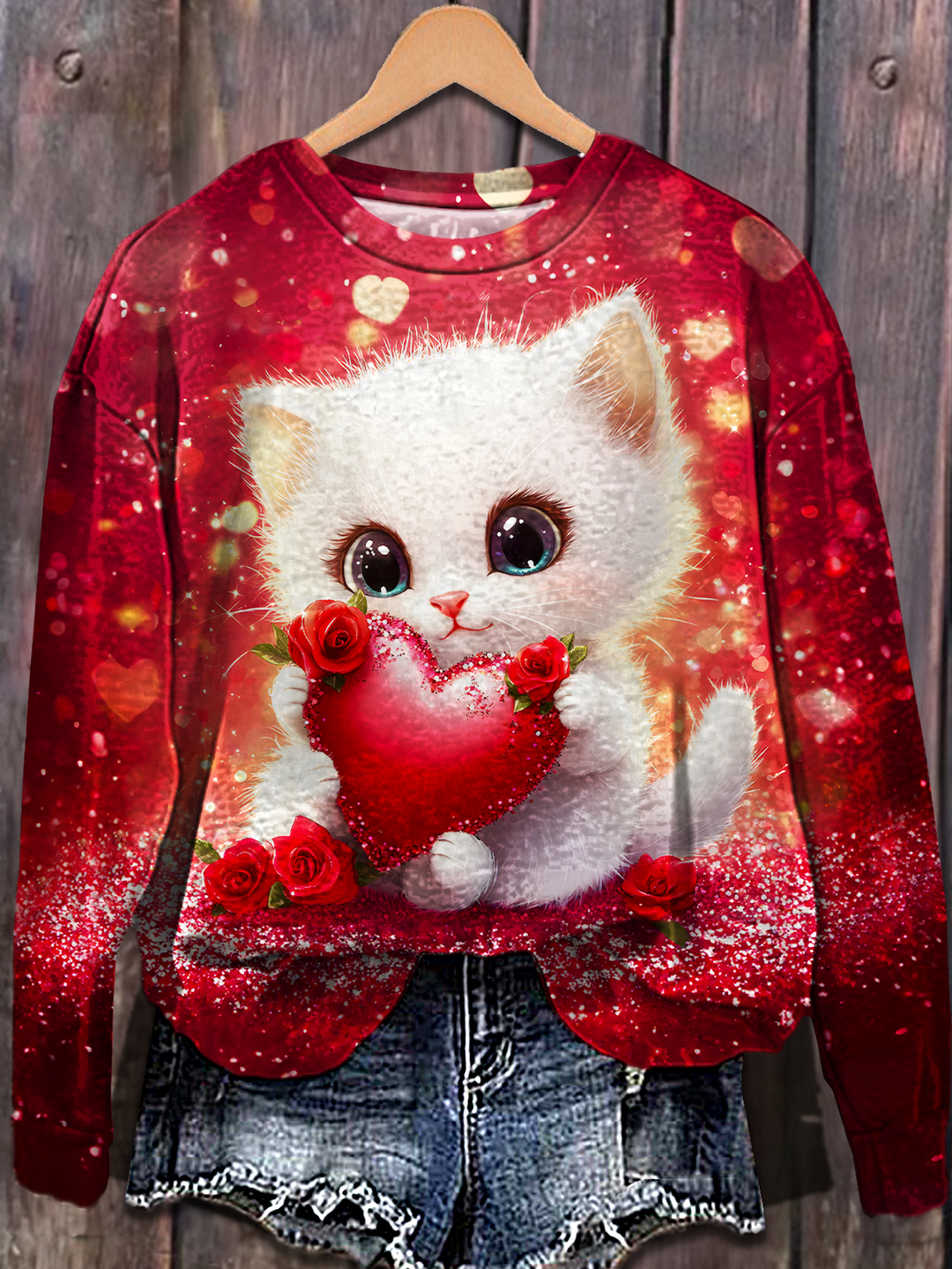 Cute Valentine Kitty With Heart Valentine's DayPrinted Long Sleeve Casual Top