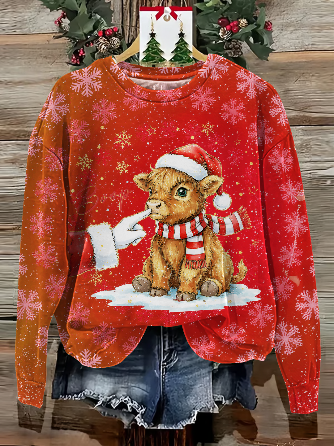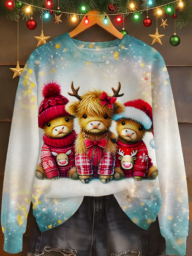 Winter Christmas Highland Cow Print Long Sleeve Casual Top