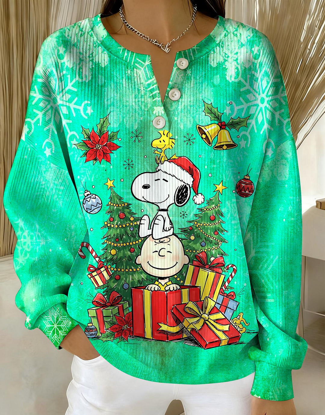 Winter Christmas Snoopy Print Knitted Button Long-Sleeved Top