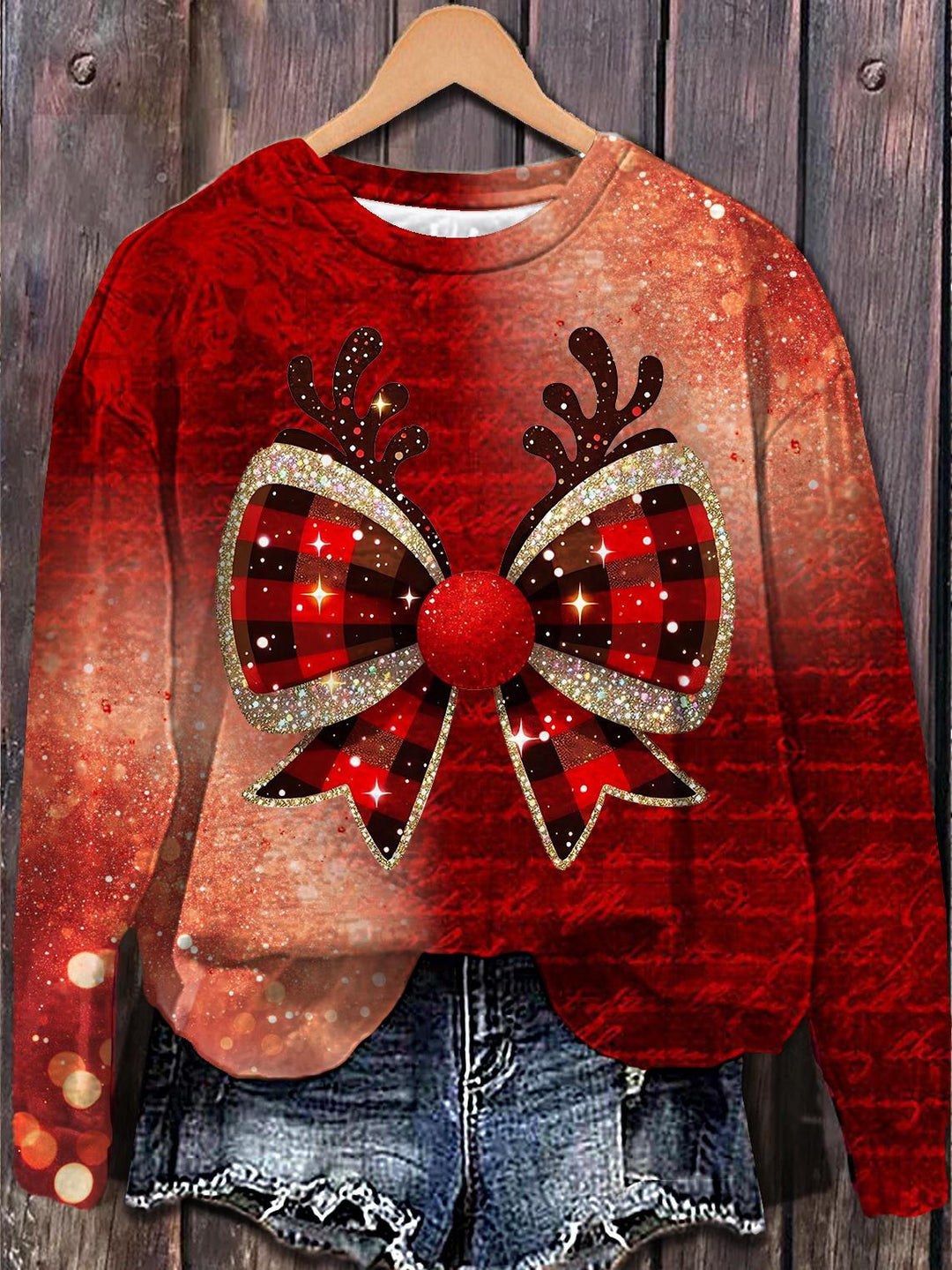 Deer Horn Bow Printed Long Sleeve Casual Top