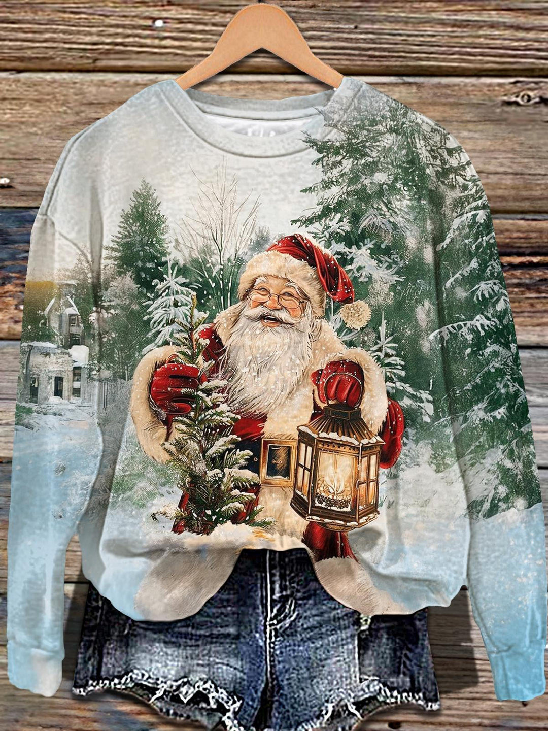 Christmas Retro Santa Claus Printed Long Sleeve Casual Top