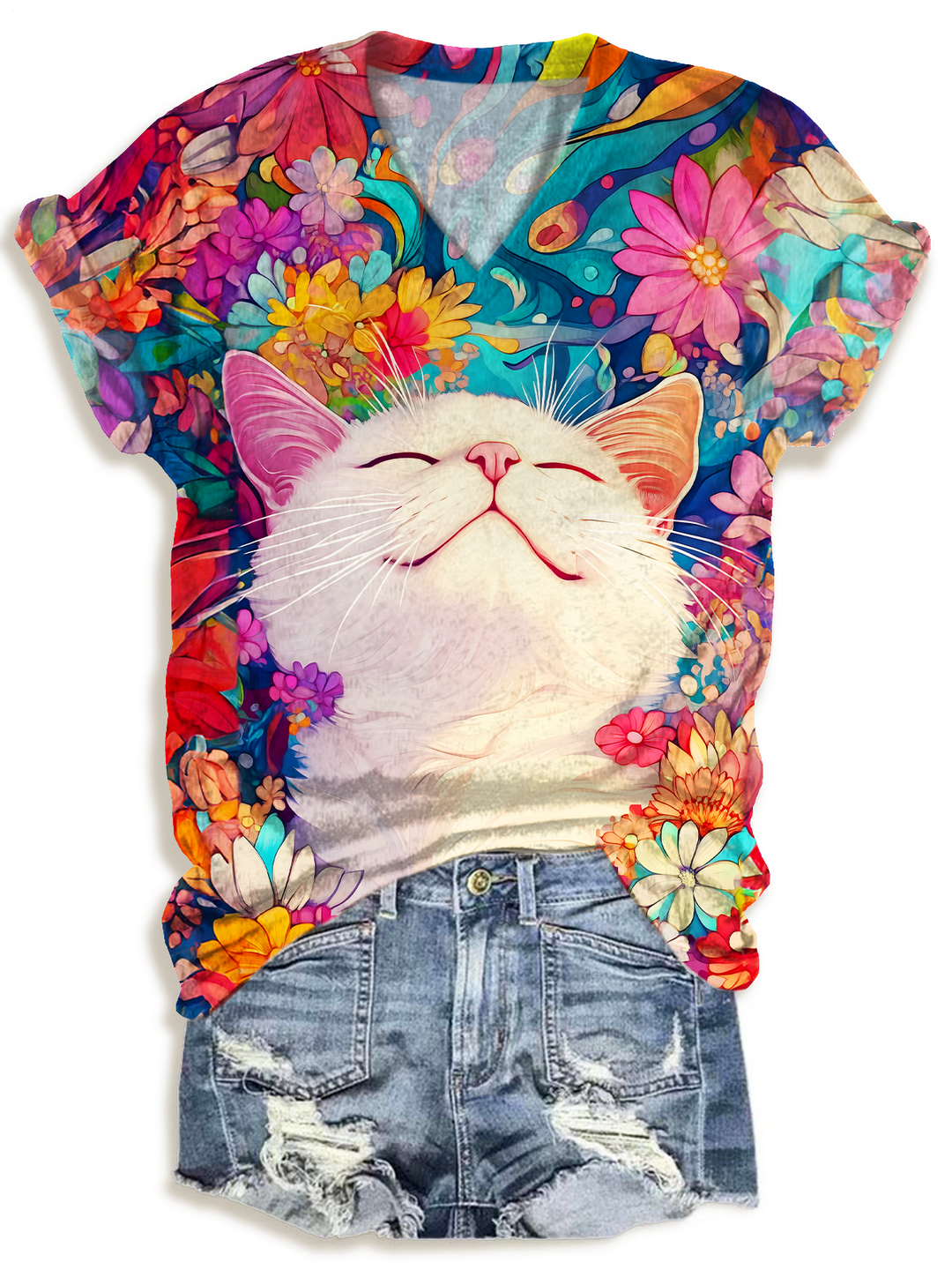 Spring And Summer Flowers Cute Cats V-neck T-Shirt