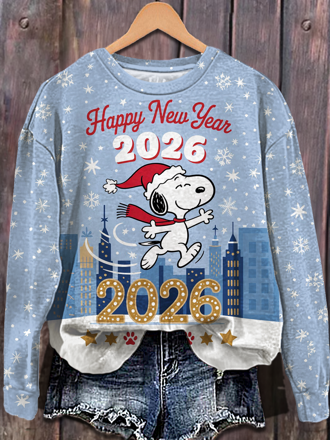 HAPPY NEW YEAR 2026 Snoopy Printed Long Sleeve Casual Top