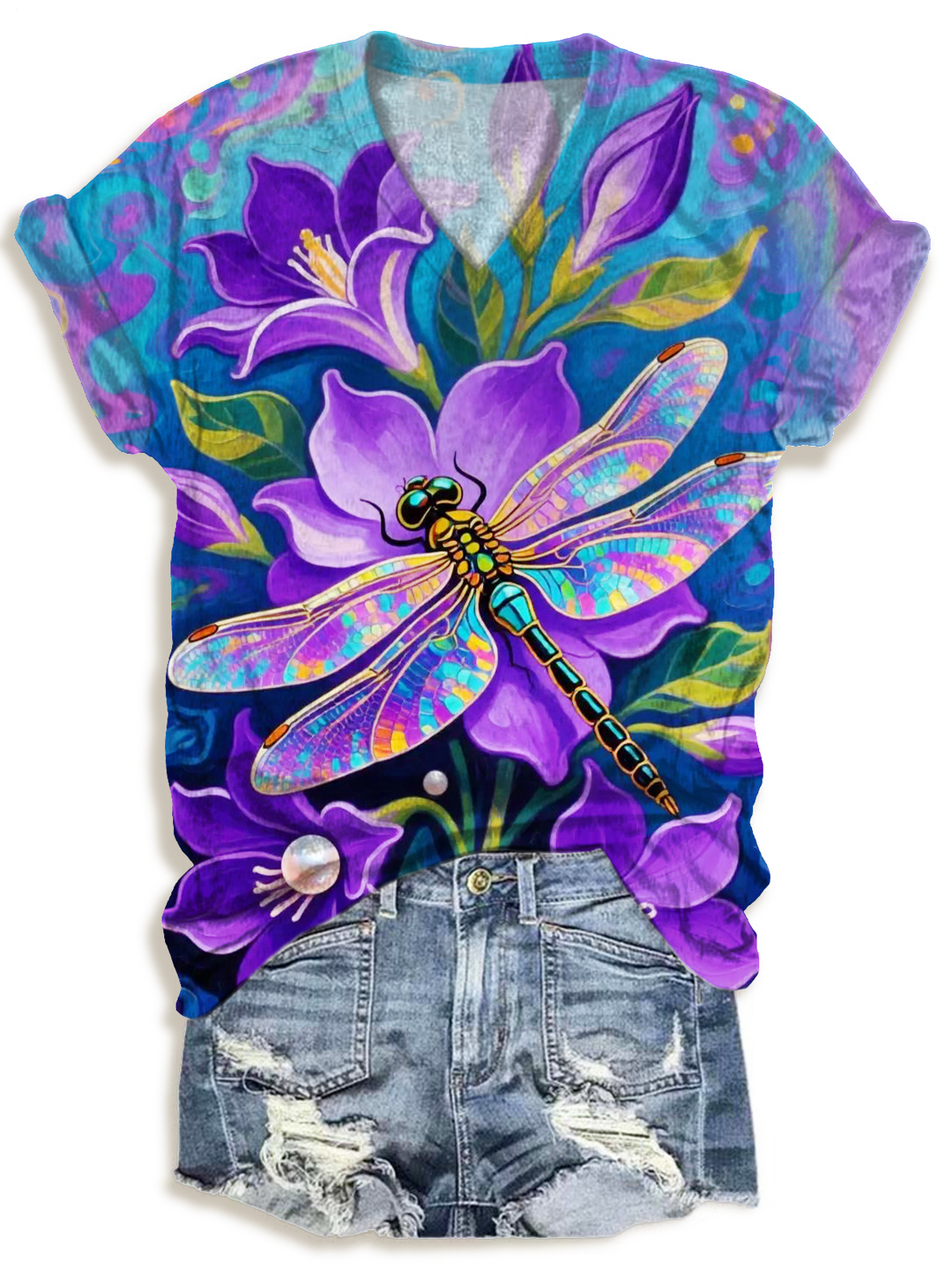 Flower Dragonfly V-neck T-Shirt